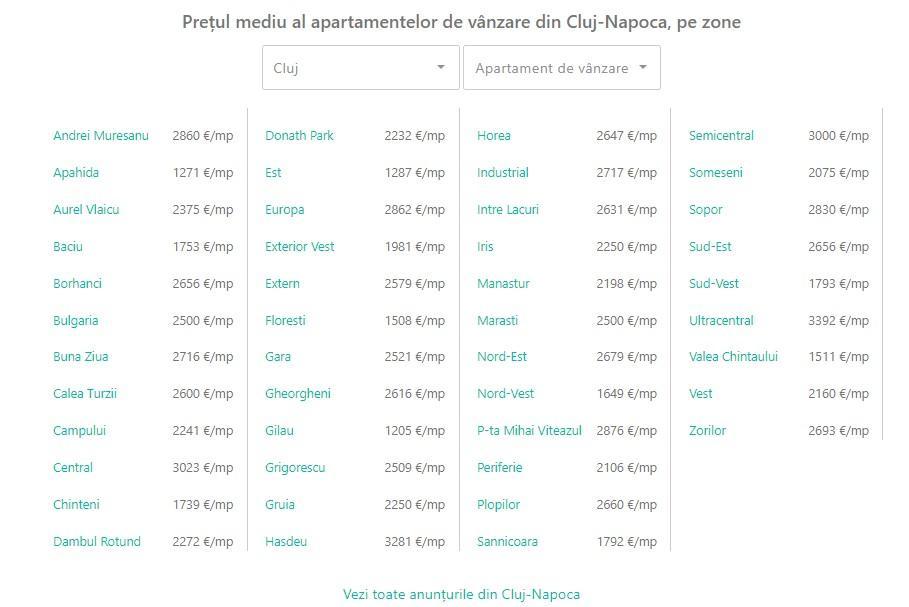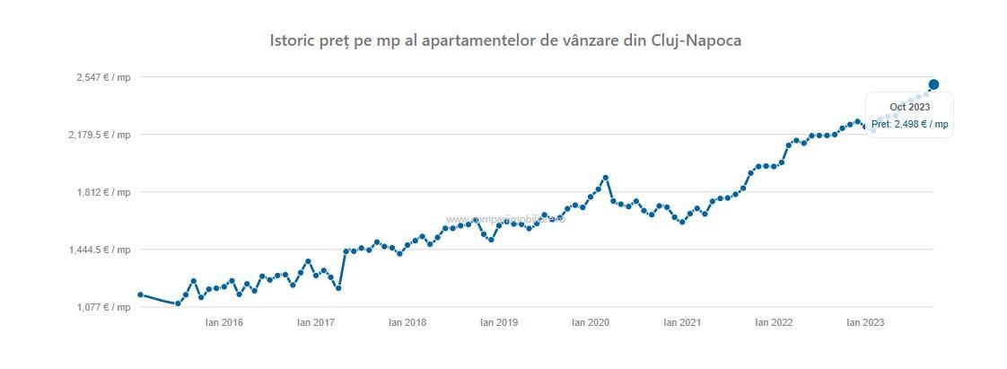 Prețul mediu al apartamentelor de vânzare din Cluj-Napoca, în octombrie 2023 a fost de 2.498 euro/mp, în creștere cu 64 euro/mp cu față de august 2023 (2.434 euro/mp) și este cu 280 de euro peste aceeași perioadă a anului trecut (2.218 euro/mp), conform statisticilor Compariimobiliare.ro.