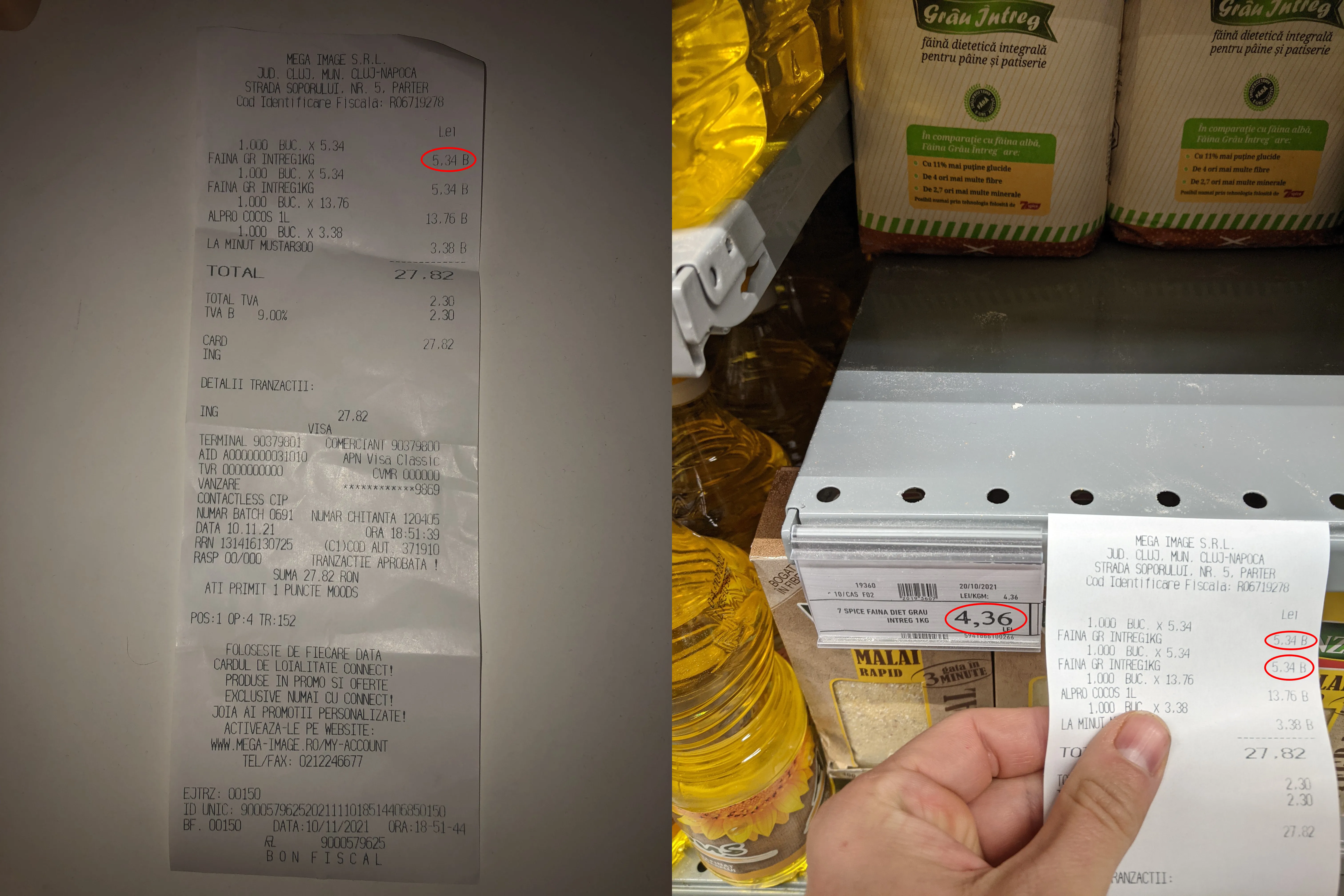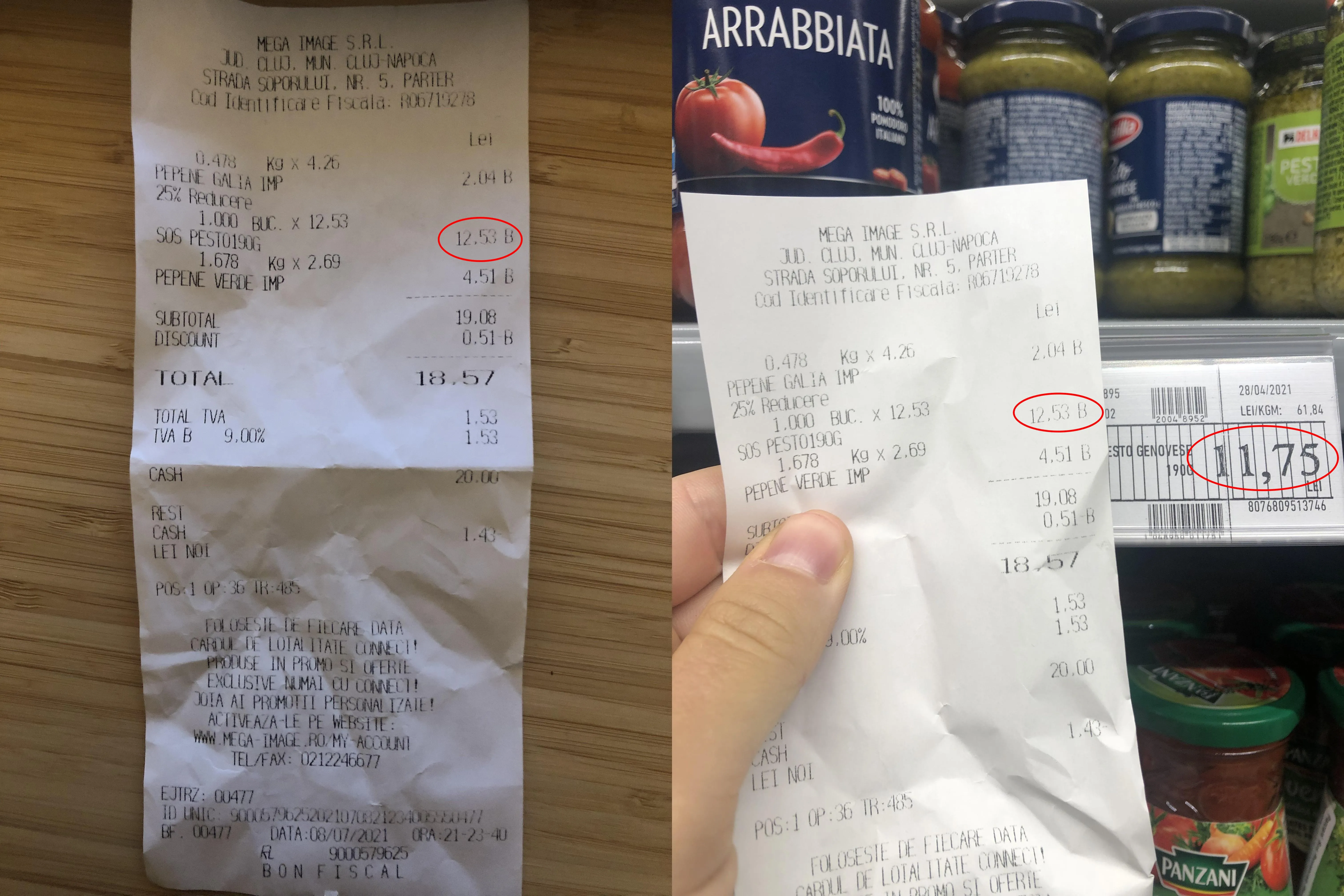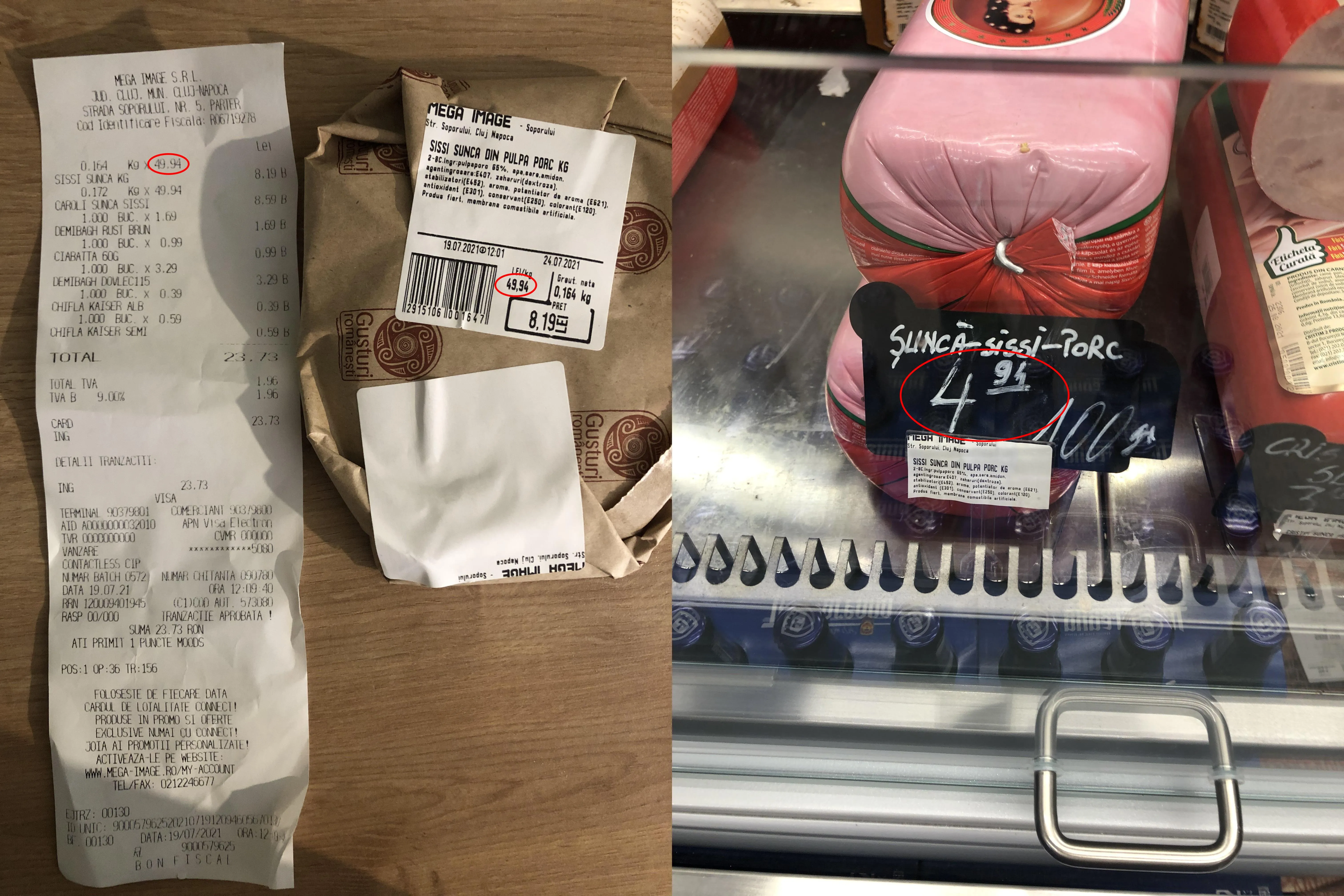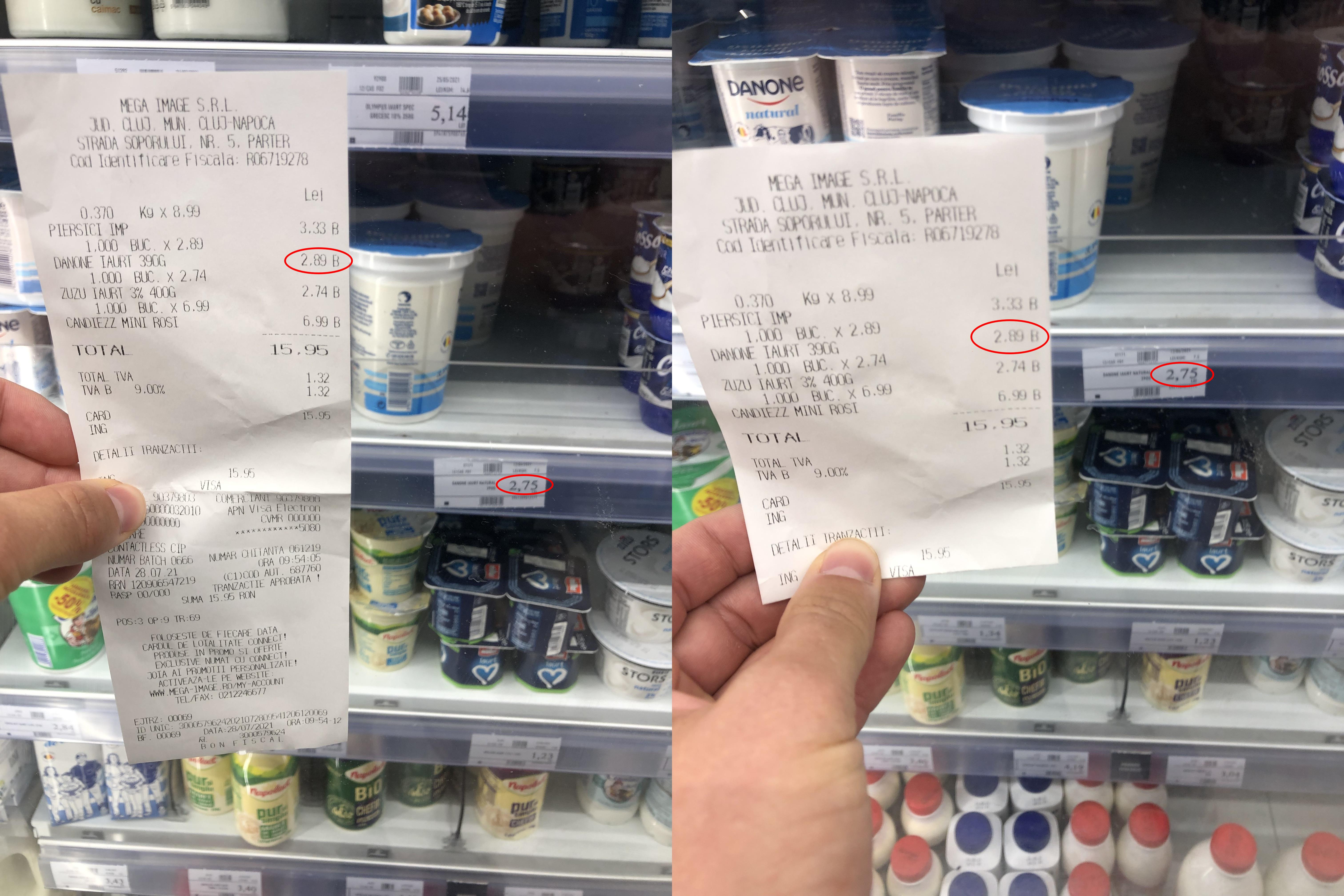 Un clujean a observat în zile succesive prețuri diferite între raft și casa de marcat la supermarketul Mega Image, de pe strada Soporului, numărul 5.
