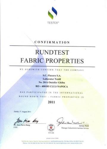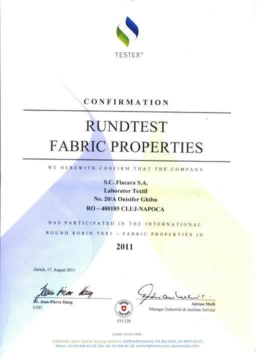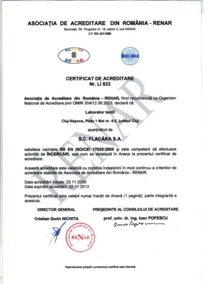 Laboratorul Textil al S.C. Flacara S.A este singurul acreditat RENAR ( Asociatia de Acreditare din Romania - Organism National de Acreditare ) din Transilvania, care efectueaza teste pe materiale textile si produse finite executate din materiale textile, in vederea determinarii principalilor parametri caracteristici ai acestora.