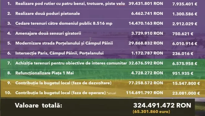 De asemenea, beneficiarul va ceda terenuri pentru noi drumuri și ”amenajarea ca zonă verde a terenurilor proprietate publică de pe malul stâng al râului Someș, adiacente str. Nădășel, în suprafață de 2,1 ha, construirea a două poduri pietonale spre parcul Armătura și spre zona verde ce urmează să fie amenajată pe malul stâng al Someșului Mic, adiacent str. Nadăș, realizarea unui pod rutier peste râul Someșul Mic în continuarea str. Câmpul Pâinii cu tramă de patru benzi auto, două trotuare și două piste velo, sistematizarea circulației rutiere în Piața 1 Mai, sistematizarea circulației aferente străzii Porțelanului, realizarea străzii Câmpul Pâinii între podul nou propus și str. Paris la 4 benzi carosabile, bandă de biciclete, 1 trotuar, 1 trotuar de gardă, alveolă pentru stație de transport în comun, amenajarea ca zonă verde a parcelelor cuprinse între zona reglementată și râul Someșul Mic, însumând o suprafață de 0.25 ha, parcelele care au fost achiziționate după demararea documentației”.