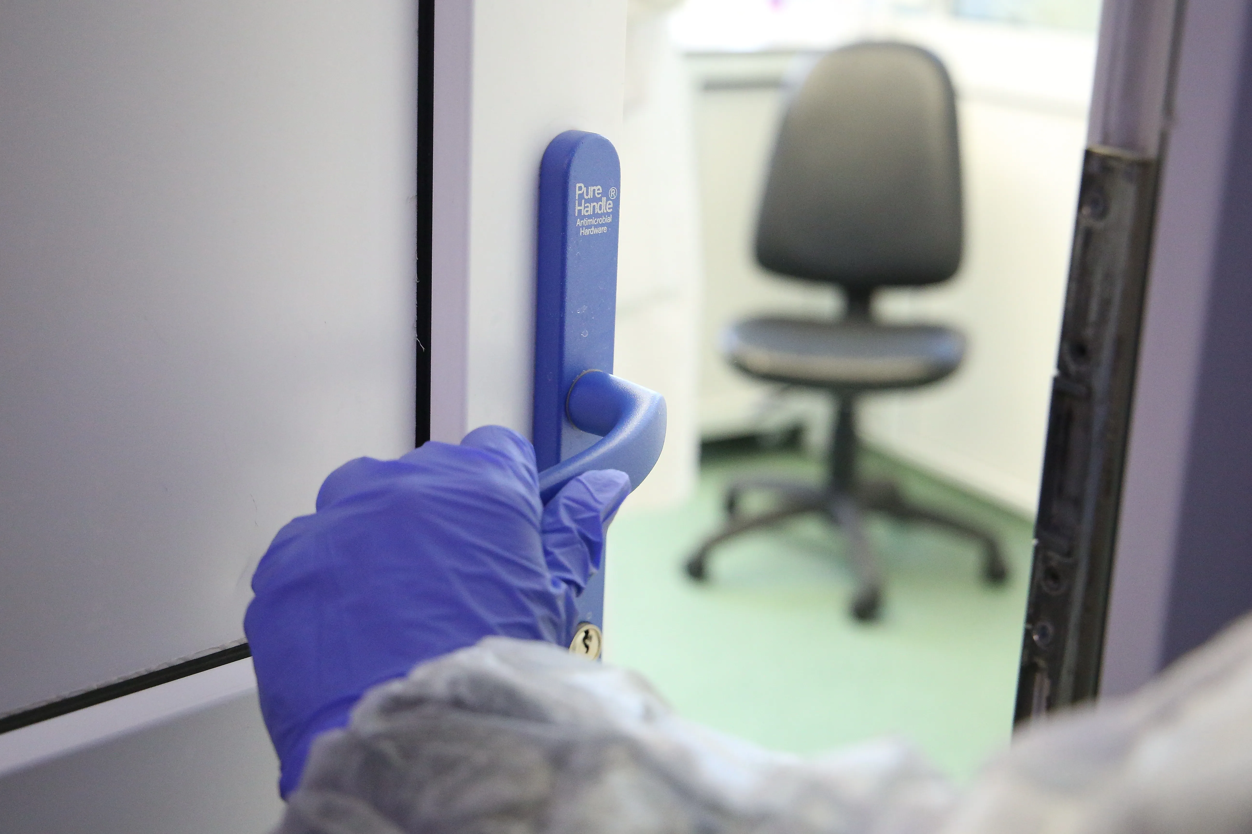 Virusurile pot rezista pe clanțele ușilor de la câteva ore până la câteva zile, o variabilă importantă în acest sens fiind materia primă din care este realizat mânerul respectiv. În cazul mânerelor antimicrobiene, viața microorganismelor este limitată. Acestea s-au dovedit eficiente împotriva noului coronavirus, cu o reducere de 90% în 30 de minute. Testarea antivirală a fost efectuată la un laborator terț, folosind un mâner PureHandle, împotriva unei tulpini Munchen, virus surogat utilizat în laboratoare ca o alternativă apropiată, dar mai sigură, la tulpinile patogene ale coronavirusului.