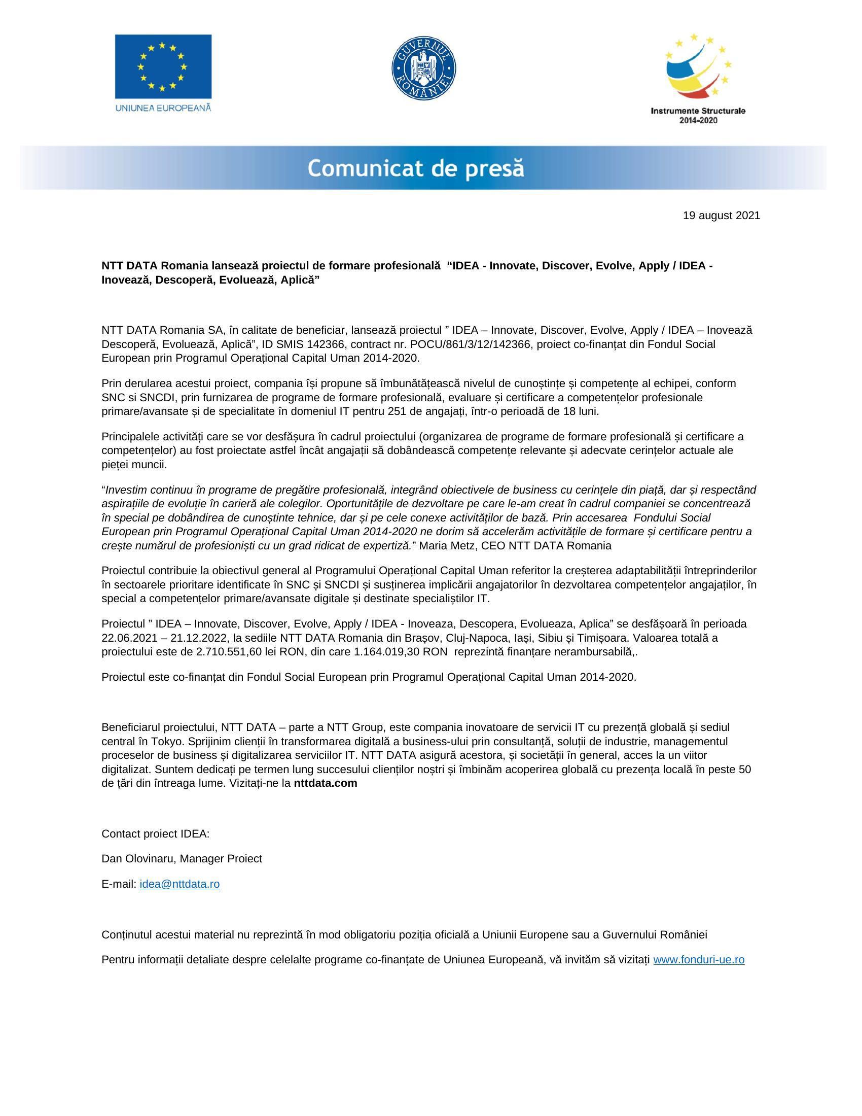 NTT DATA Romania lansează proiectul de formare profesională “IDEA - Innovate, Discover, Evolve, Apply / IDEA - Inovează, Descoperă, Evoluează, Aplică”