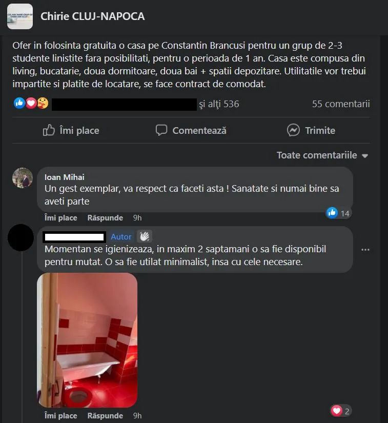 ”Ofer în folosință gratuită o casă pe Constantin Brâncuși pentru un grup de 2-3 studente liniștite fără posibilități, pentru o perioadă de 1 an. Casa este compusă din living, bucătărie, două dormitoare, două băi + spații depozitare. Utilitățile vor trebui împărțite și platite de locatare, se face contract de comodat”, este anunțul postat de femeie pe un grup de Facebook, conform Ziua de Cluj. Ulterior anunțul a dispărut, probabil cererea fiind enormă.