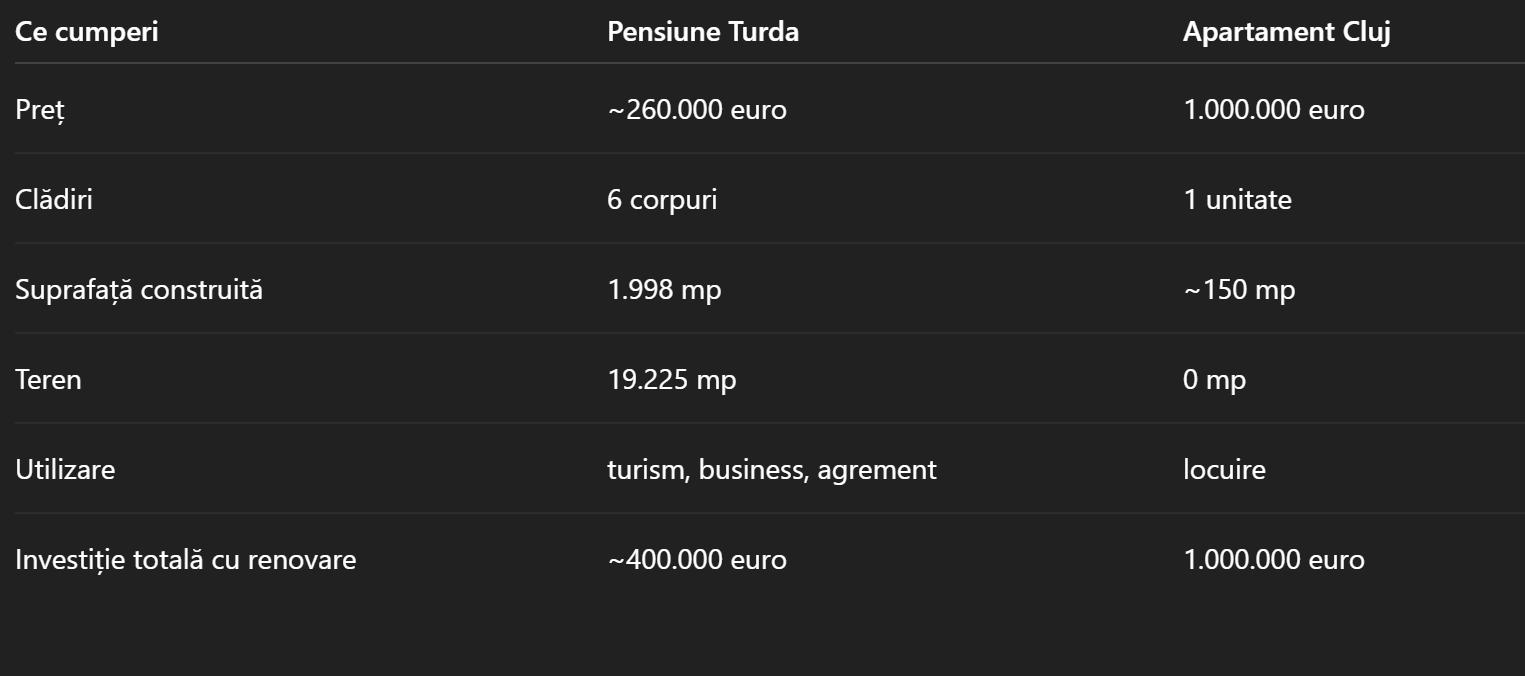 Făcând un calcul simplu, rezultă că cu banii de pe un singur apartament de lux în Cluj, îți poți cumpăra nu mai puțin de patru pensiuni în Turda. Cu tot cu teren, clădiri, și – de ce nu – un business turistic la cheie.