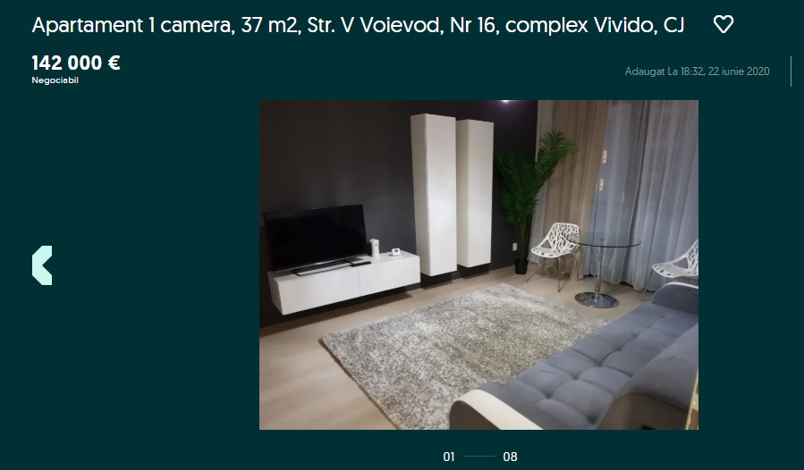 Proprietarul își laudă ”marfa”: ”Apartament nou, compus din: 1 cameră de zi, 1 bucătărie,1 baie, 1 hol, având suprafațamutilă de 37.07 mp, 1 logie, cu suprafaţa de 1.89mp. Teren atribuit in proprietate. Utilat si mobilat lux. finisaje moderne, nu a fost inchiriat / utilizat. Centrala termica de apartament, incalzire in pardoseala, cuptor electric, masina spalat vase, plita pe gaz, hota, frigider, cuptor cu microunde, mașină de spălat haine. Vedere spre lacul Iulius Mall, in complexul rezidential VIVIDO, corpul 1B (din fata). Curte interioară cu mini parc. Parcare subterană, cafenea + mini Auchan la parter, la 1 min de FSEGA și 5 min de Iulius Mall”.