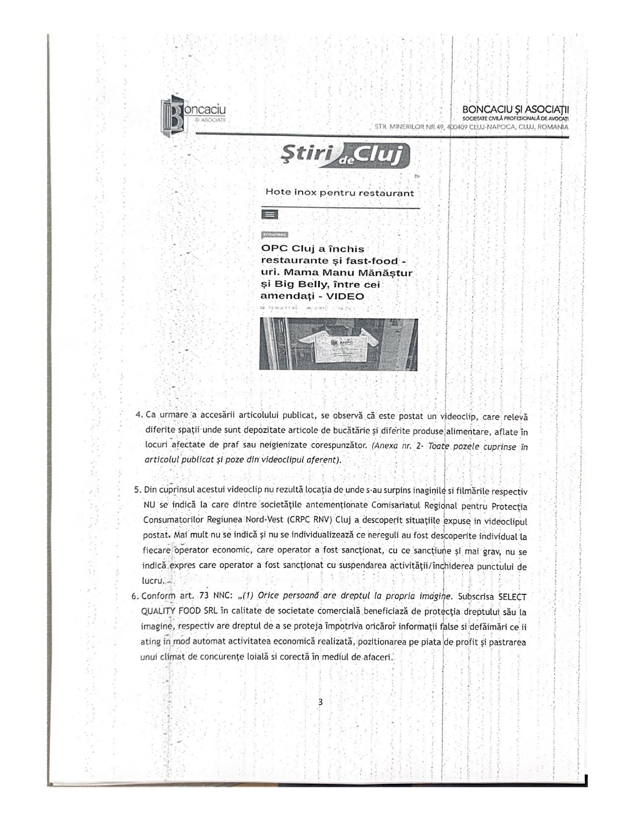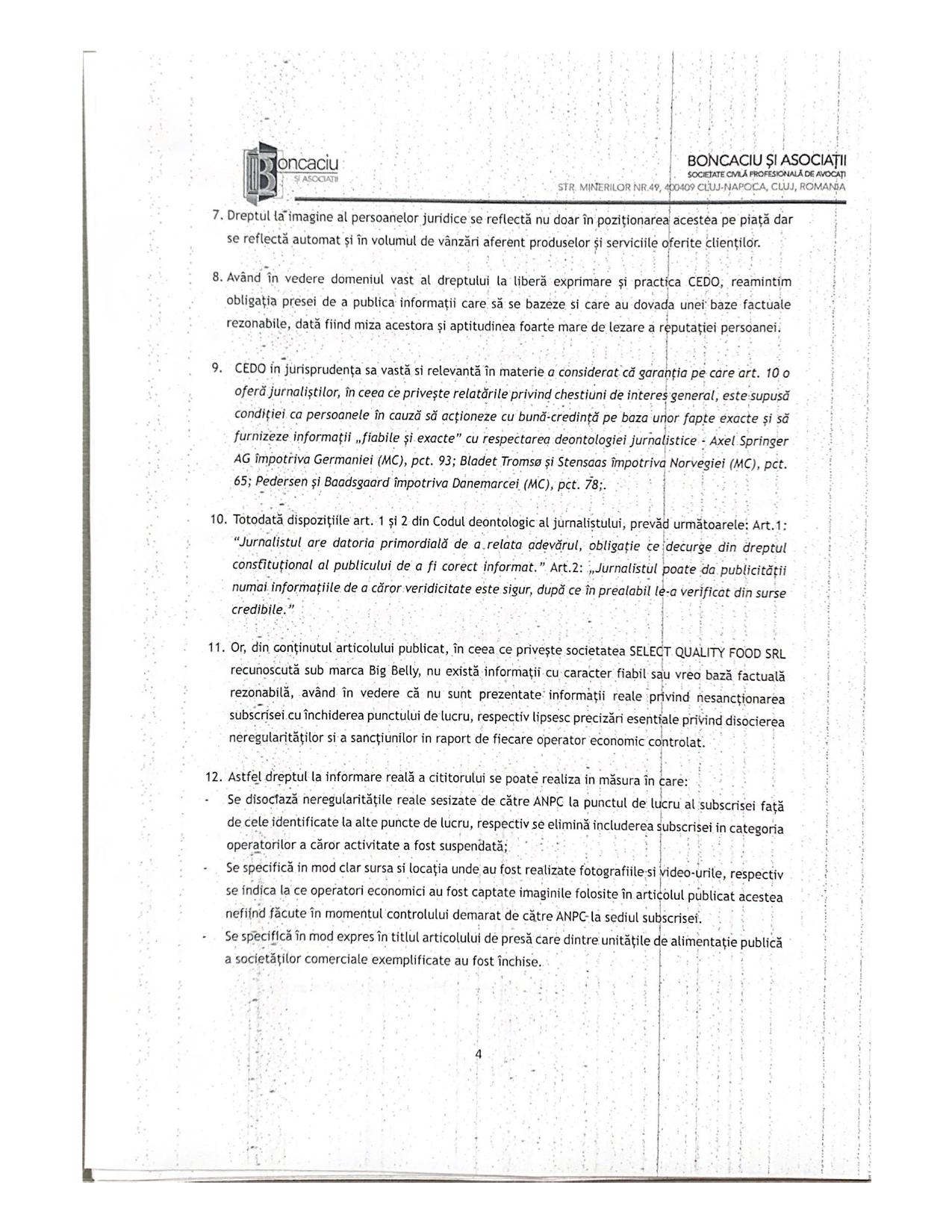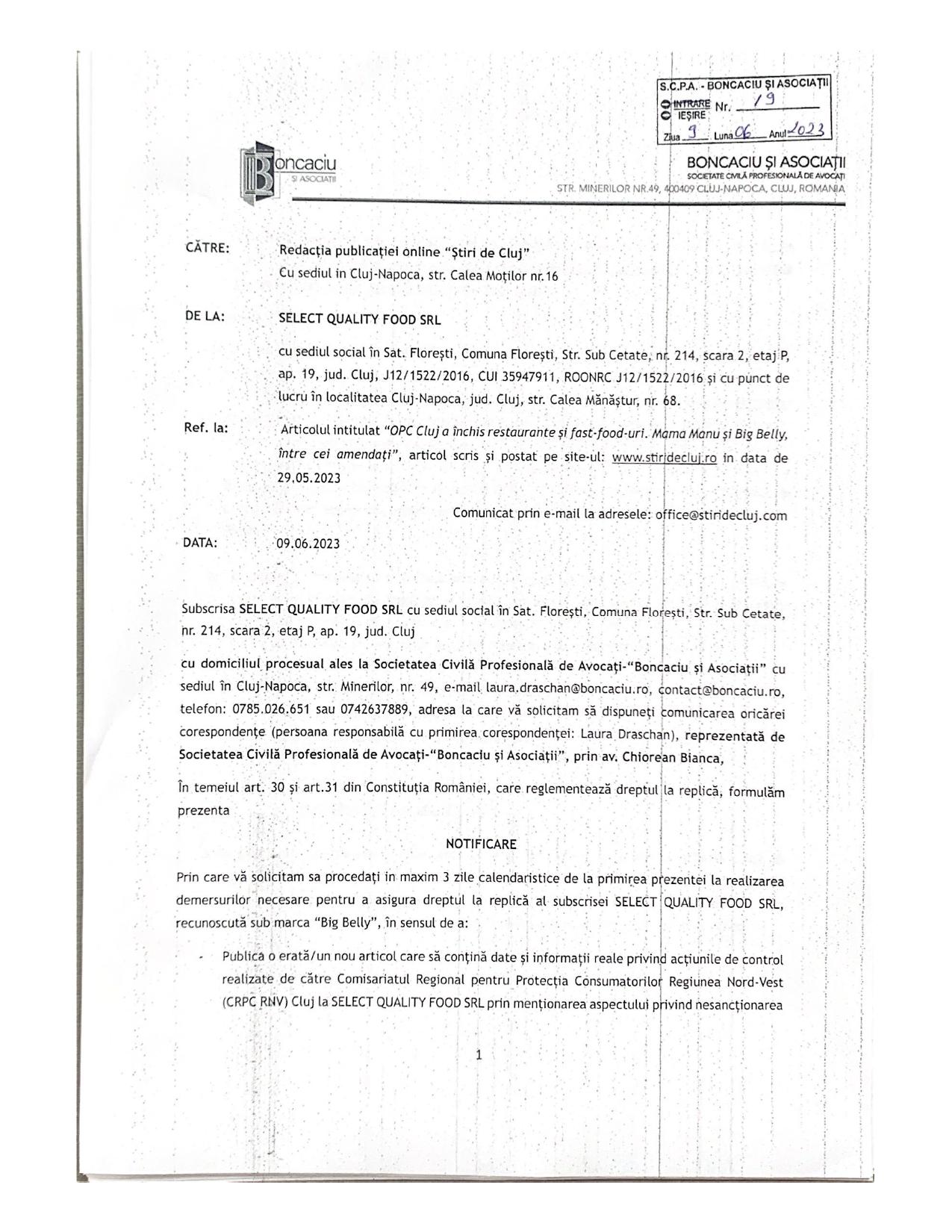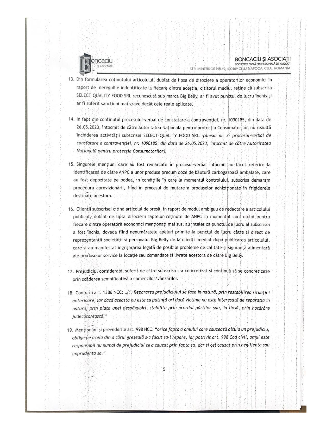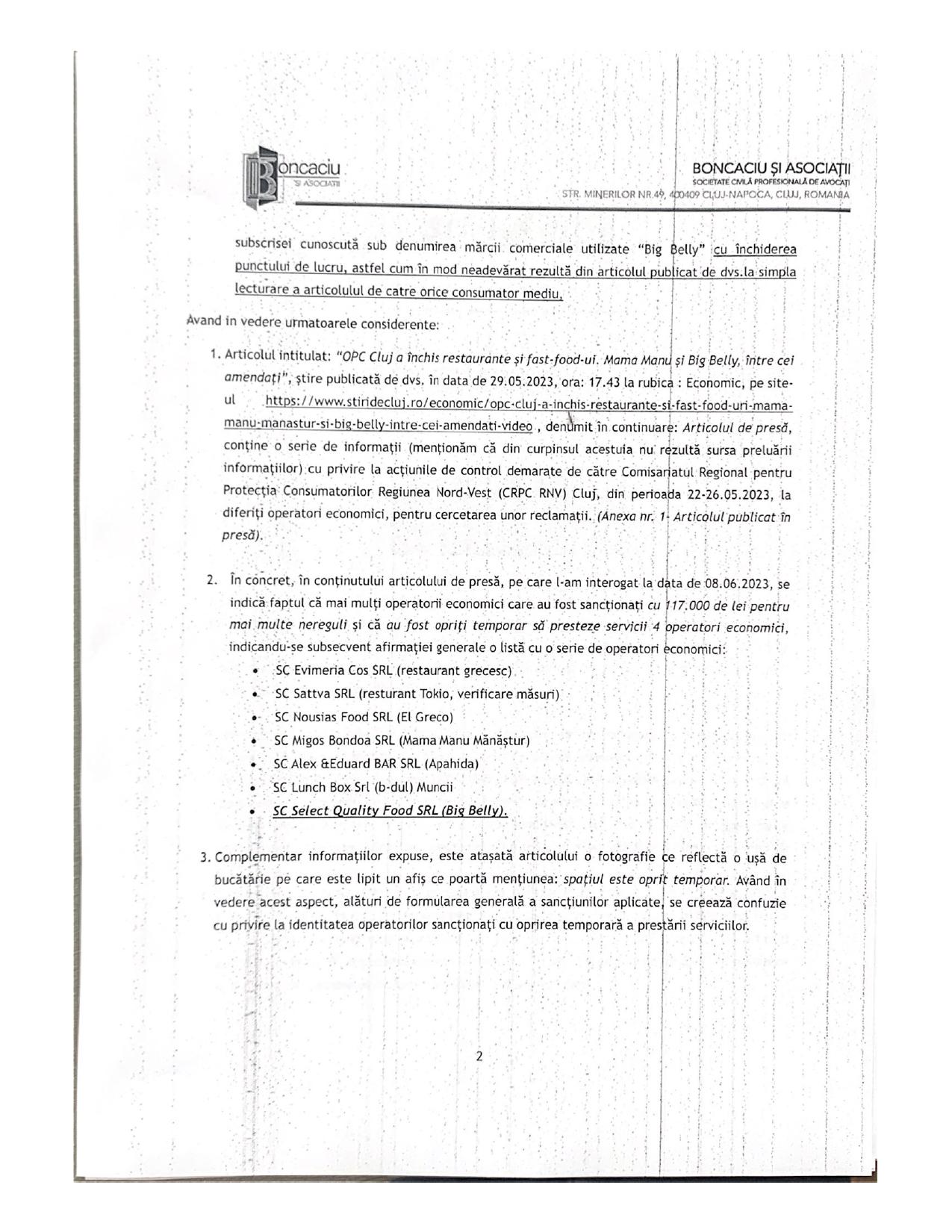 Reprezentanții Big Belly precizează că din aceste date se înțelege că unitatea a fost închisă, dar inspectorii nu au menționat unitatea la categoria ”Operatorii economici care au fost sancționați”. Redăm mai jos punctul de vedere al celor de la Big Belly, fiind un drept la replică.