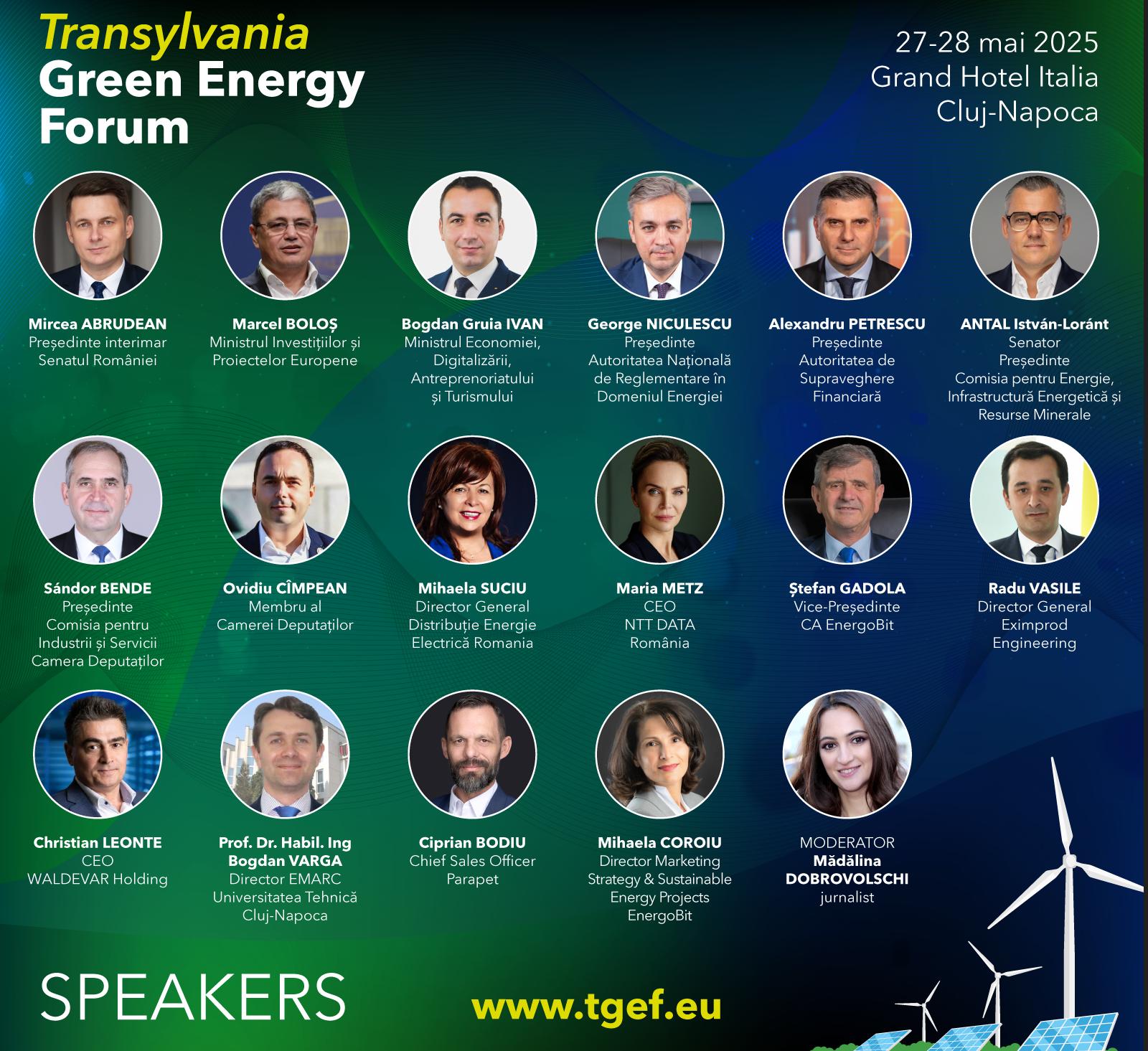 „Suntem încântați să anunțăm primele confirmări pentru Transylvania Green Energy Forum 2025. Lista speakerilor și partenerilor este în continuă actualizare, iar temele abordate vor reflecta cele mai noi tendințe și provocări din domeniul energiei verzi. În prima zi, dezbatem subiecte precum tranziția către neutralitate carbonică până în 2050, evidențiind politici și tehnologii esențiale pentru reducerea emisiilor și decarbonizarea sectoarelor critice. De asemenea, vom discuta despre inovațiile tehnologice în domeniul energiei verzi, inclusiv progresele în tehnologiile fotovoltaice, soluțiile de stocare a energiei și dezvoltarea hidrogenului verde.