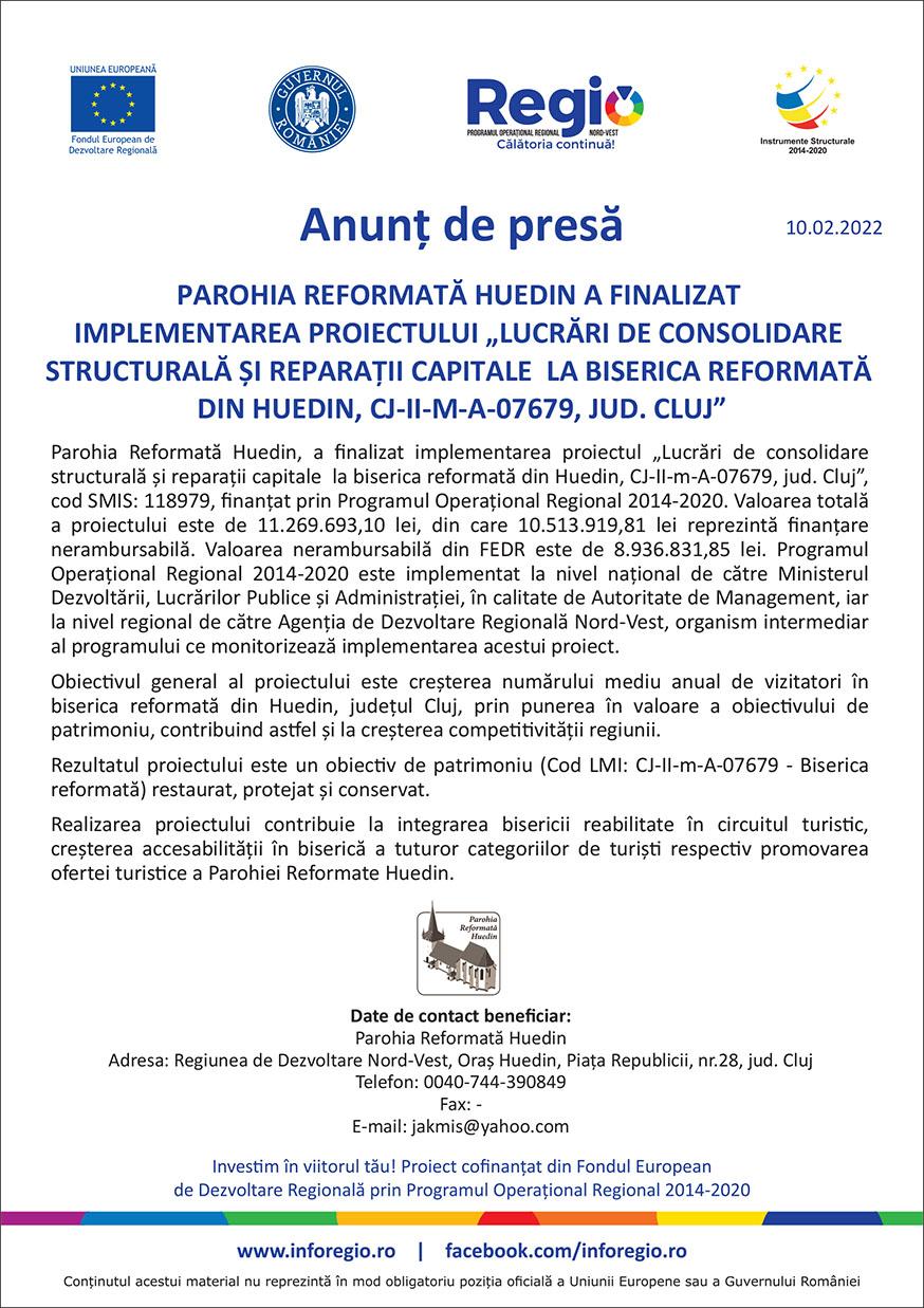 Parohia reformată Huedin a finalizat implementarea proiectului de reabilitare a bisericii reformate din Huedin