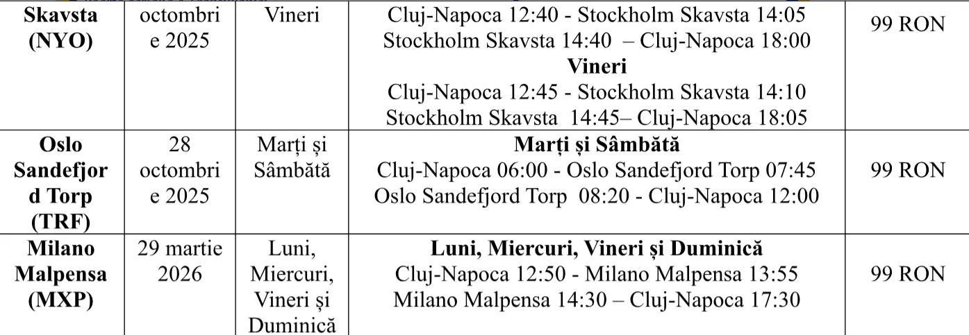 Potrivit anunțului, zborurile spre Marrakesh vor fi operate începând cu 26 octombrie 2025, de două ori pe săptămână, joia și duminica. Din 27 octombrie, vor fi introduse curse spre Stockholm Skavsta, în zilele de luni și vineri, iar din 28 octombrie, zboruri spre Oslo Sandefjord Torp, în zilele de marți și sâmbătă.