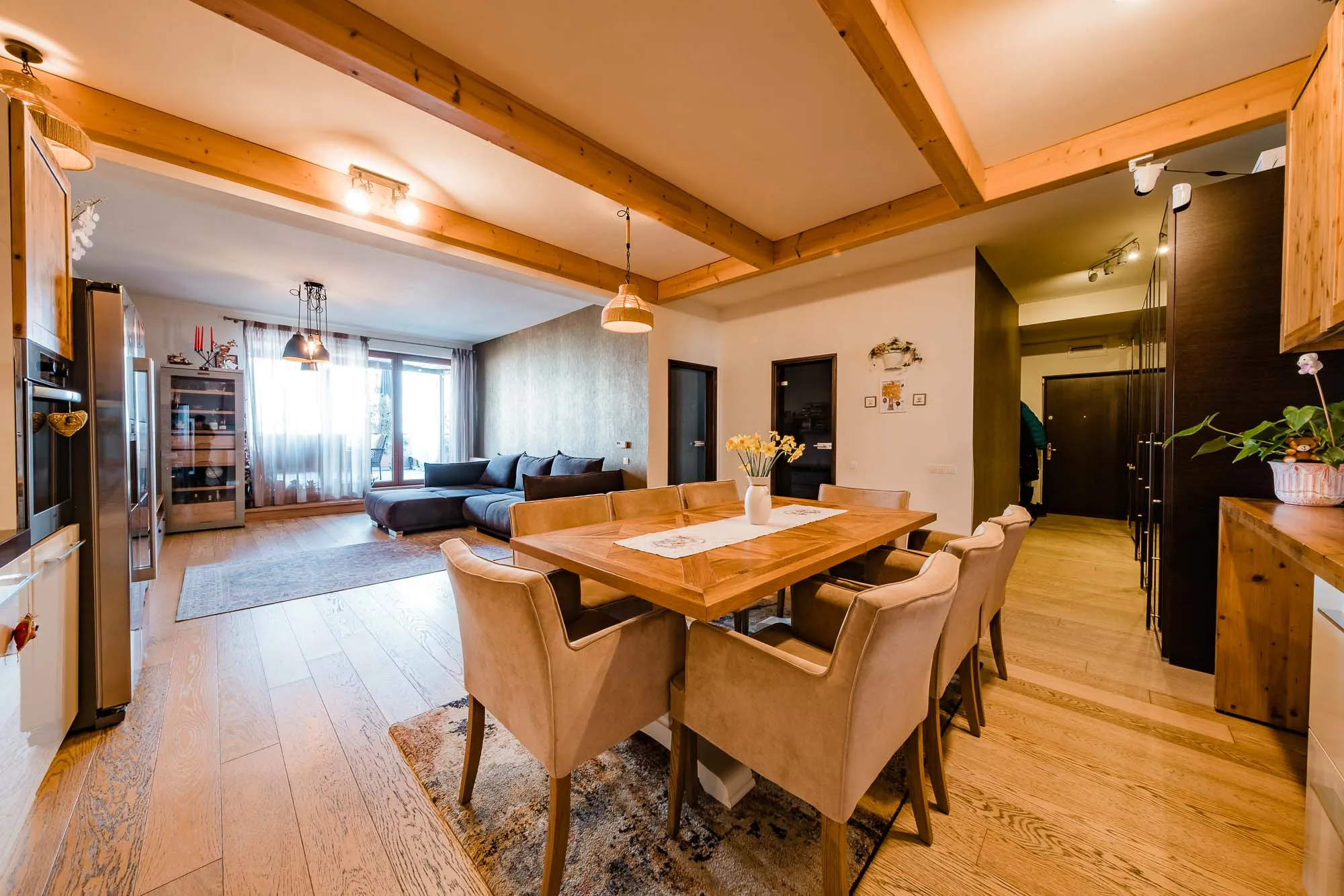 Apartamentul are open kitchen și zonă de dining luminoase, mobilier modern, finisaje de calitate și parcare în garajul de sub apartament. Se vinde mobilat ceea ce reduce la zero timpii de așteptare până la relocare și savurarea cafelei și a spectacolului oferit de oraș de pe terasă”, se arată în anunțul imobiliar.