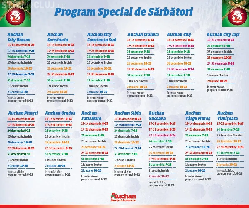 Supermarketul Auchan, din Iulius Mall Cluj, va avea un program special de sărbători.