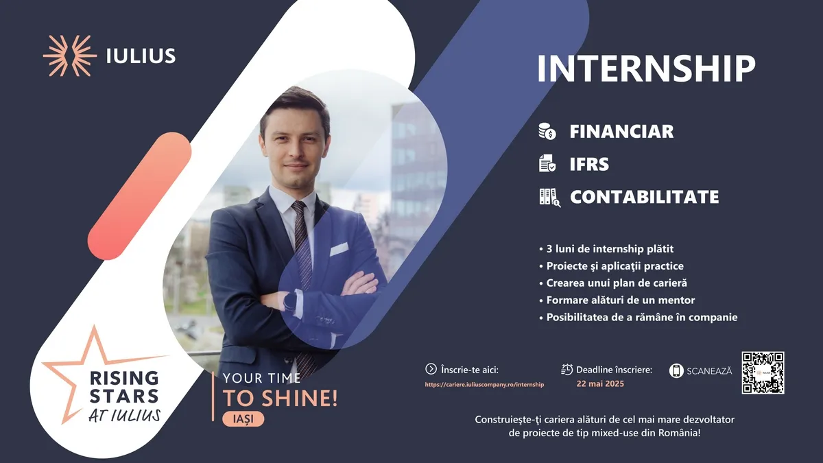 Compania IULIUS lansează o nouă ediție a programului de internship „Rising Stars at IULIUS”, oferind oportunități reale de dezvoltare profesională tinerilor aflați la început de drum. Cei interesați se pot înscrie până pe 22 mai 2025, accesând link-ul oficial: https://cariere.iuliuscompany.ro/internship.