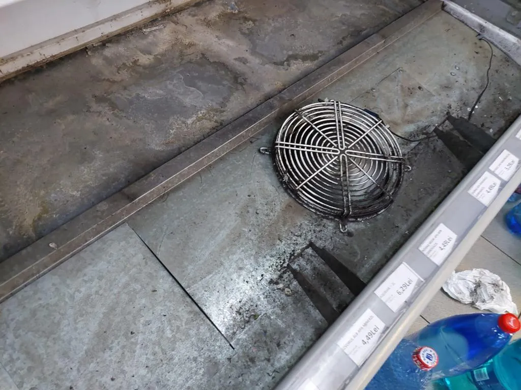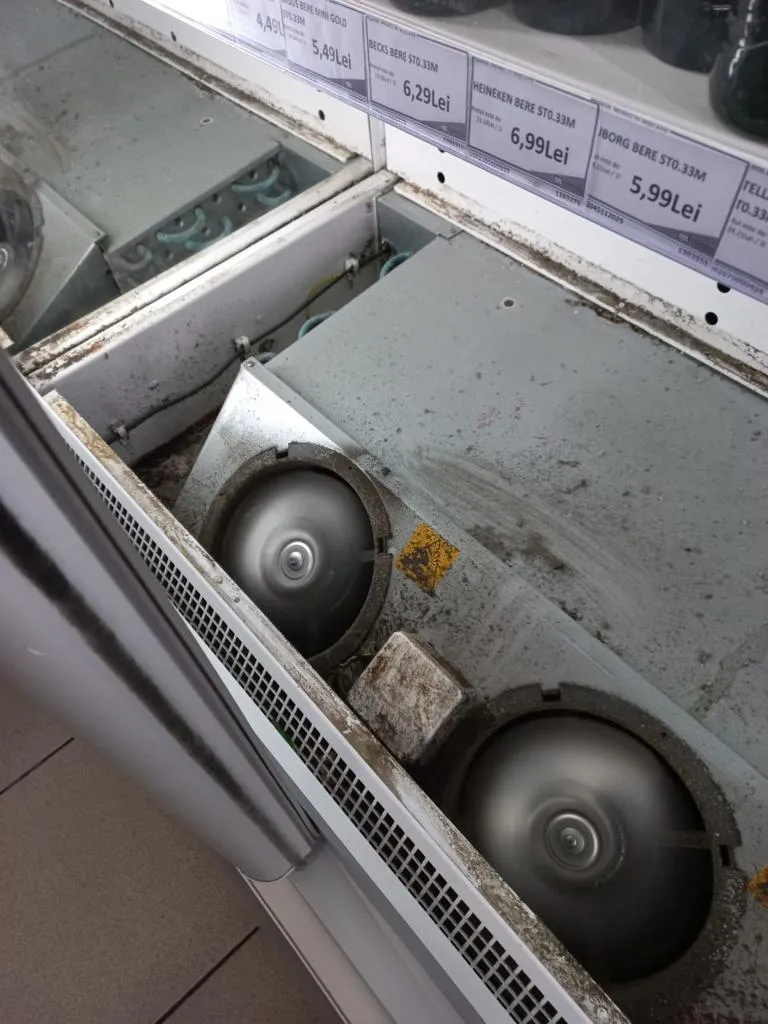 - vitrine frig neigienizate și murdare, pline de praf, mizerie și insecte moarte