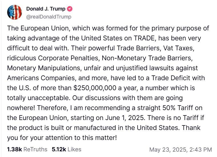 Președintele SUA, Donald Trump, a anunțat pe 23 mai 2025 intenția de a impune un tarif vamal de 50% asupra tuturor produselor provenite din Uniunea Europeană, începând cu 1 iunie. Această măsură vine ca urmare a frustrării administrației americane față de negocierile comerciale cu UE, care, potrivit lui Trump, nu au dus la rezultate concrete. El a acuzat Uniunea Europeană de practici comerciale neloiale, inclusiv taxe pe valoarea adăugată (TVA), penalități corporative, bariere comerciale non-monetare și manipulări monetare .