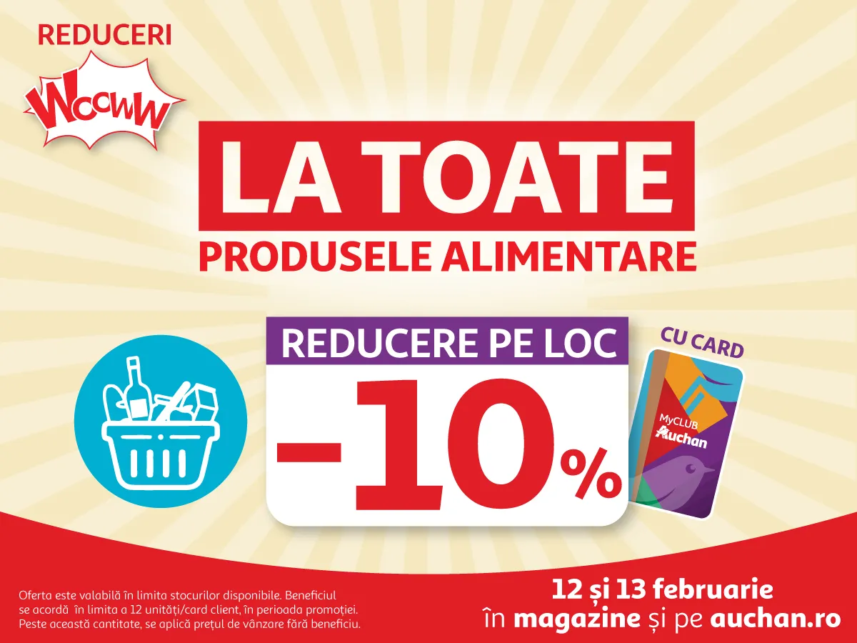 Exclusiv folosind cardul de fidelitate MyCLUB Auchan, doar în perioada 12-13 februarie, toți cei care trec pragul magazinelor Auchan sau plasează comenzi online pe auchan.ro ori în aplicația mobilă Auchan pot beneficia pe loc de o reducere de -10% la toate produsele alimentare. Detalii și regulament despre campanie sunt disponibile pe www.romania.auchan.ro.