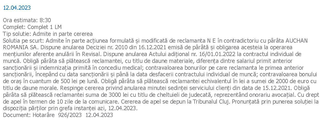 Solutia pe scurt: „Admite în parte acţiunea formulată şi modificată de reclamanta N.E în contradictoriu cu pârâta AUCHAN ROMANIA SA. Dispune anularea Deciziei nr. 2010 din 16.12.2021 emisă de pârâtă şi obligarea acesteia la operarea menţiunilor aferente anulării în Revisal. Dispune anularea Actului adiţional nr. 16/01.01.2022 la contractul individual de muncă.