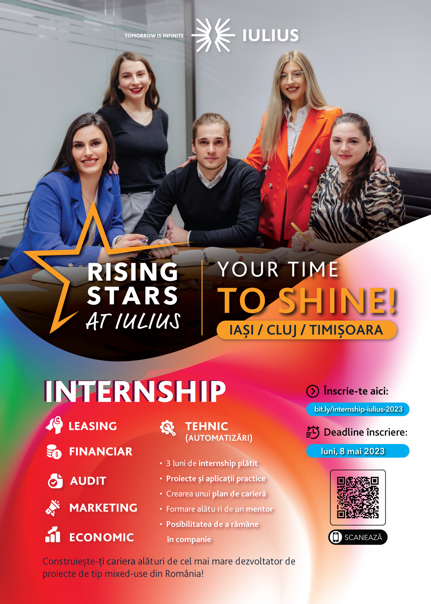 Construiește-ți cariera alături de cel mai mare dezvoltator de proiecte mixte din România, participând la programul de internship „Rising Stars at IULIUS”, desfășurat în orașele Cluj, Timișoara și Iași! Dacă ești pregătit să contribui la inițiative cu impact în comunitate și să dobândești noi cunoștințe în domeniile leasing, marketing, audit, financiar, economic și tehnic, aplică până pe 8 mai, aici!