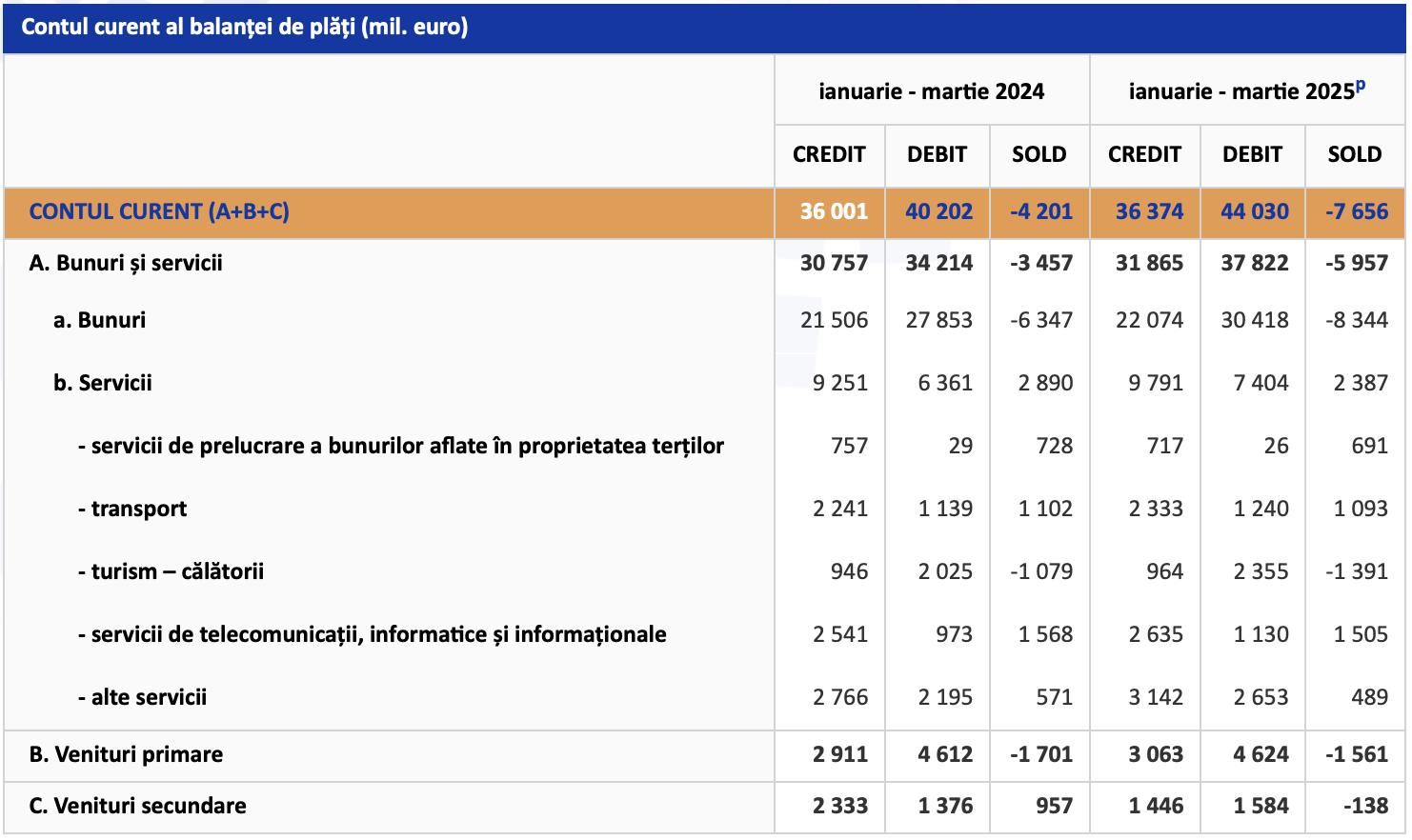 România a înregistrat un deficit de cont curent de 7,66 miliarde euro în primele trei luni ale anului 2025, în creștere cu peste 80% față de aceeași perioadă din 2024, când nivelul se situa la 4,2 miliarde euro.