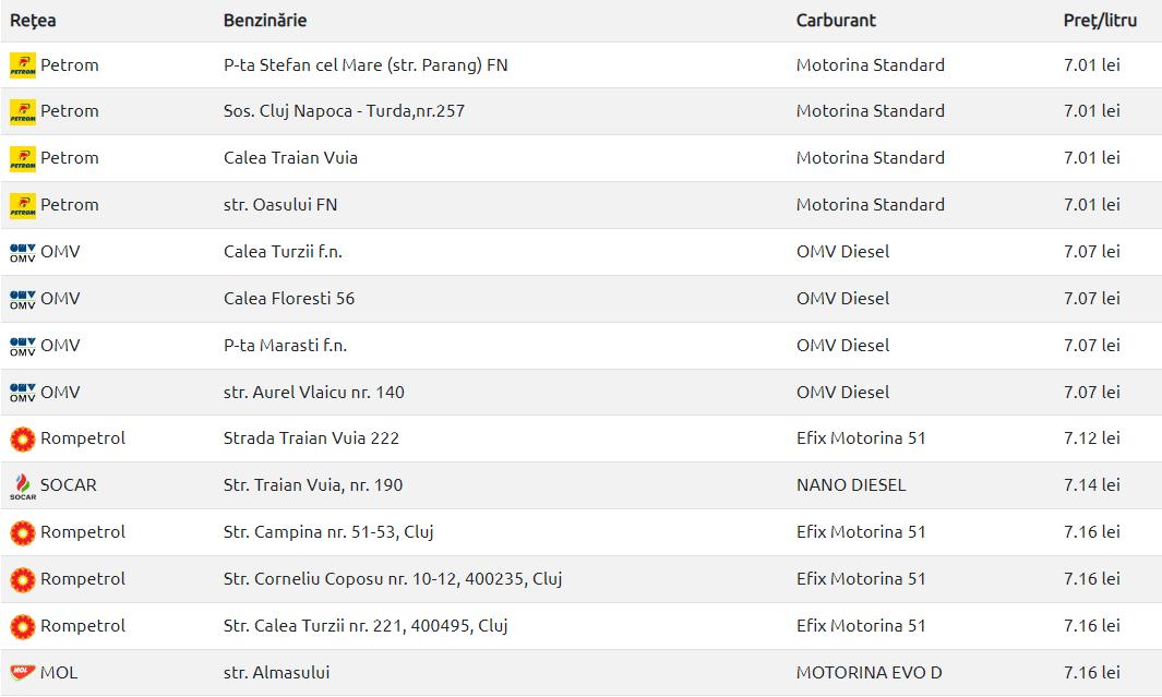 Astfel, miercuri, cea mai ieftină motorină standard costă 7.01 lei litrul la staţia Petrom din Cluj-Napoca, din Piața Ștefan cel Mare (str. Parâng).
