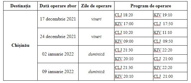 Aeroportul Internațional Avram Iancu Cluj împreună cu compania aeriană HiSky aduc în atenția publicului călător transilvănean, operarea a 4 zboruri directe pe ruta Cluj-Napoca-Chișinău-Cluj-Napoca, pe segmentul de trafic leisure, dedicate sezonului festiv de iarnă 2021-2022.