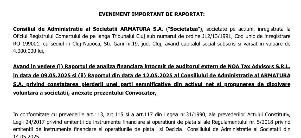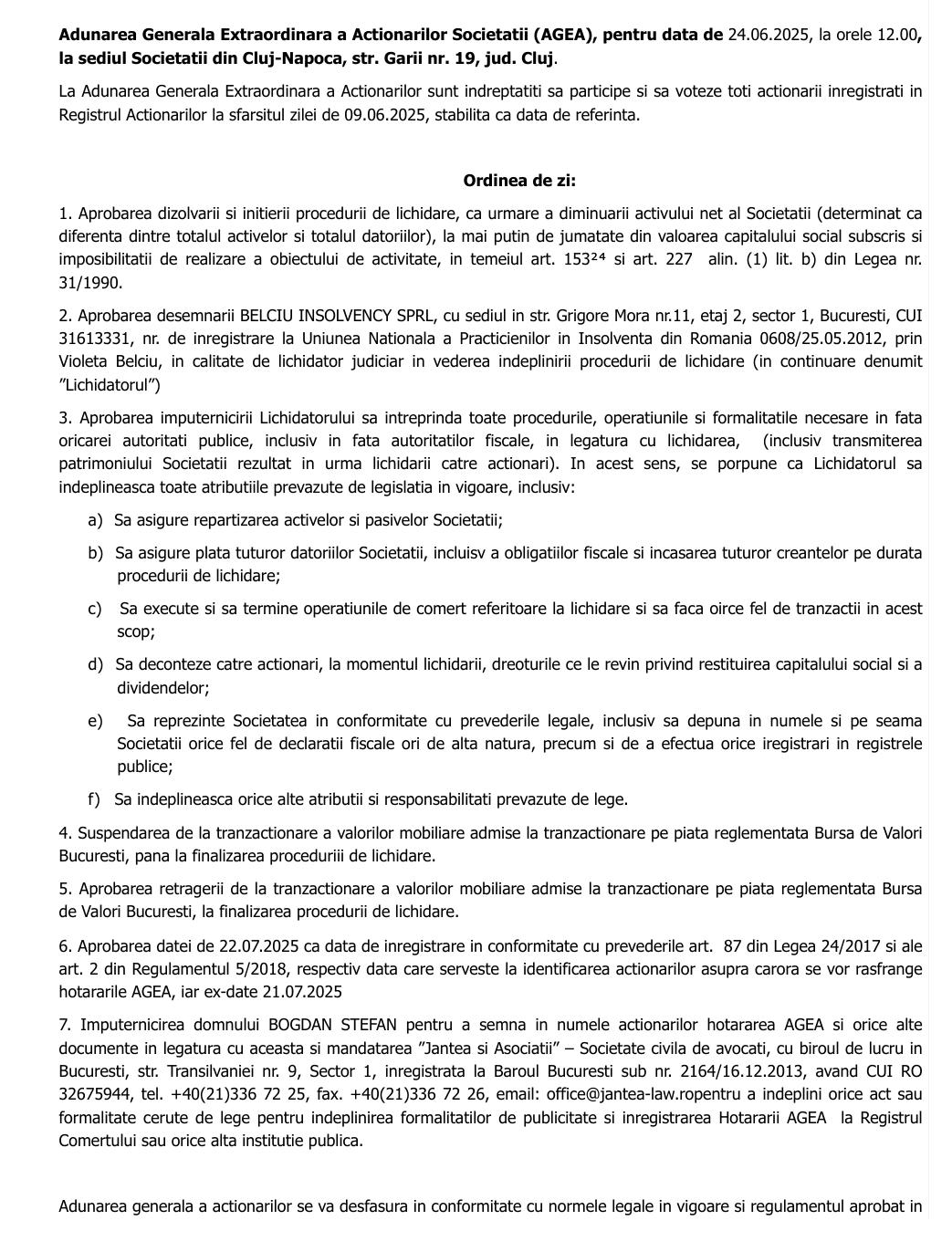 Pe ordinea de zi a ședinței se află aprobarea încetării activității de producție și inițierea procedurii de lichidare. Lichidatorul propus: Belciu Insolvency SRL. Conform legii, societatea este obligată să ia această decizie după ce activul net a scăzut sub jumătate din capitalul social, semn că firma nu-și mai poate susține nici măcar costurile de funcționare.