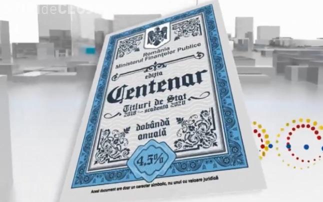 Emisiunea de titluri cu ocazia sărbătoririi Centenarului Marii Uniri este a treia în cadrul programului Tezaur-ediţia CENTENAR, iar titlurile vor putea fi achiziţionat până la 14 decembrie, conform unui comunicat al MFP. Valoarea nominală a unui titlu de stat este de 1 leu, cu maturitate de 2 ani şi o rată de dobândă de 4,5%, iar veniturile aferente sunt neimpozabile.