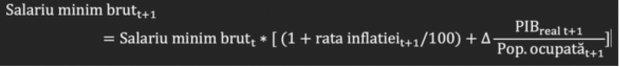 După cum se arată în document, salariul minim brut pe țară garantat în plată se stabilește sau se actualizează cu evoluția ratei inflației și cu evoluția productivității muncii prognozate, potrivit formulei: