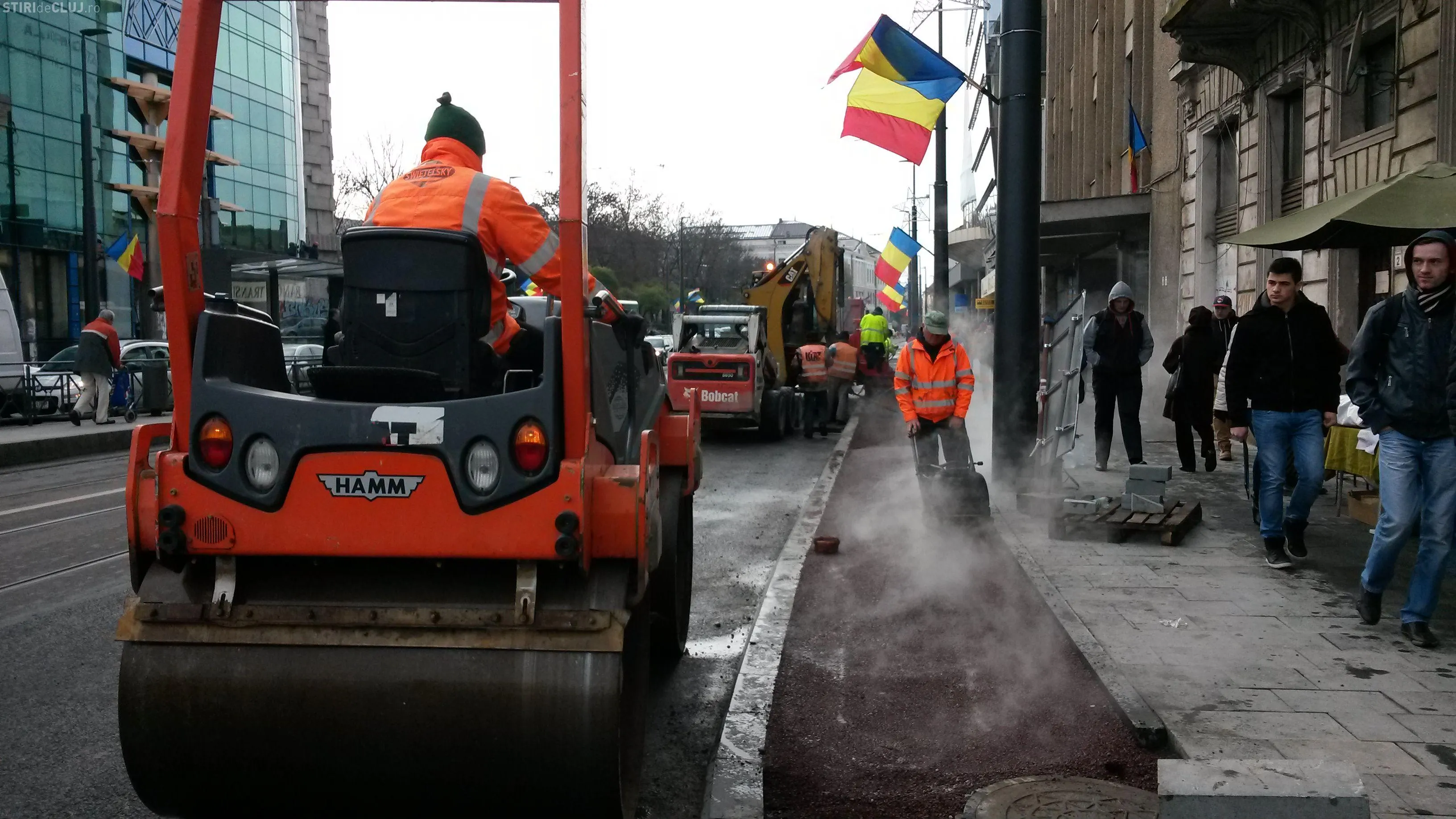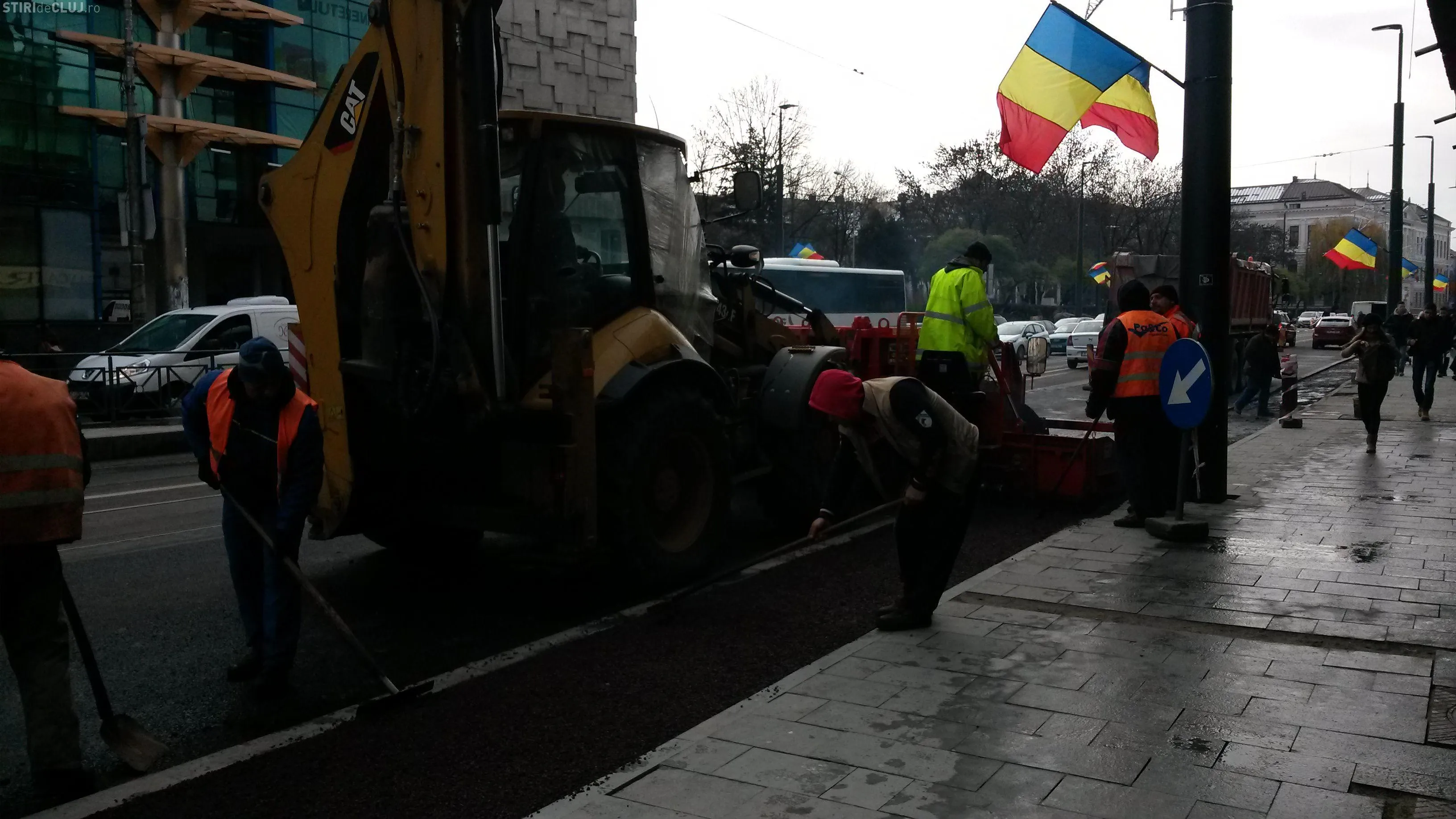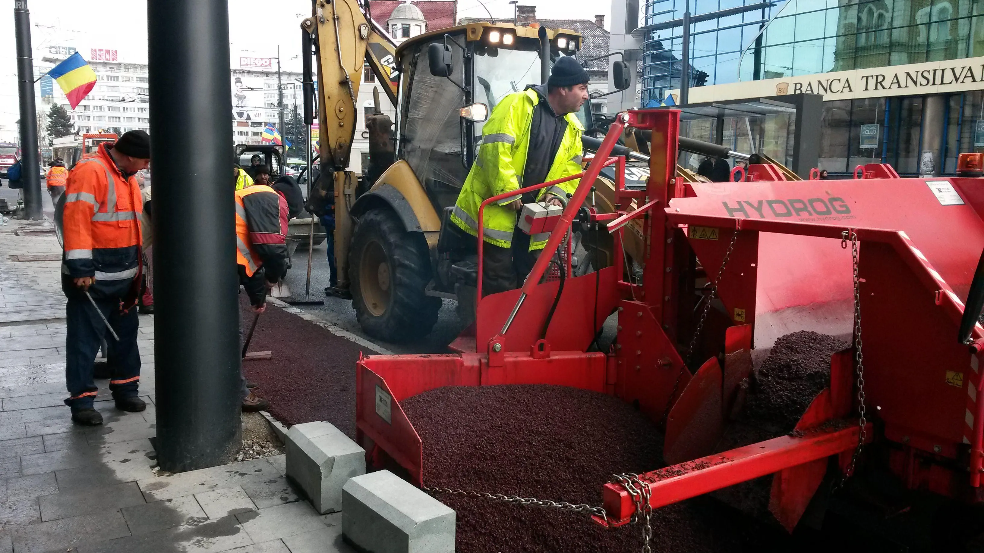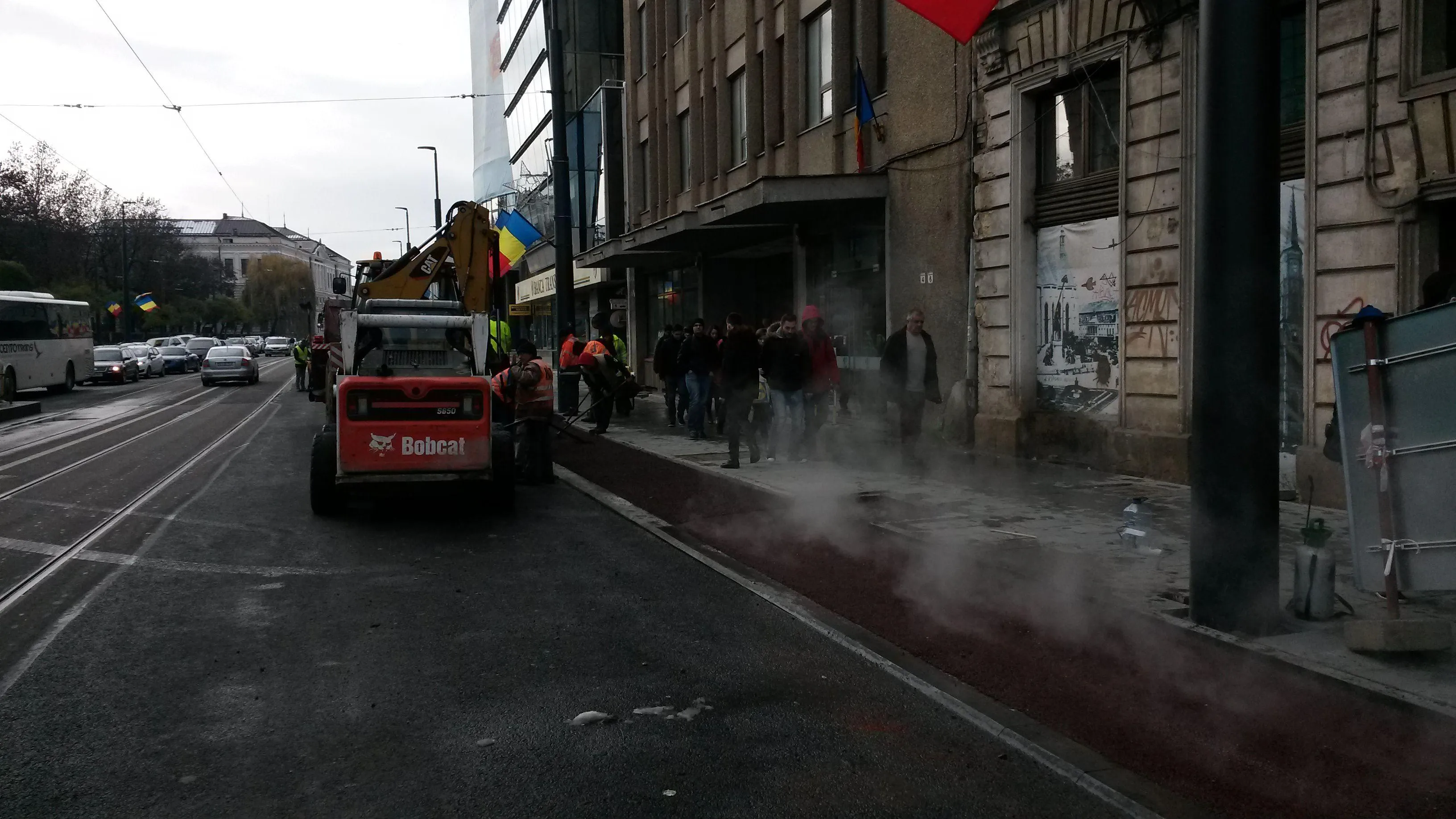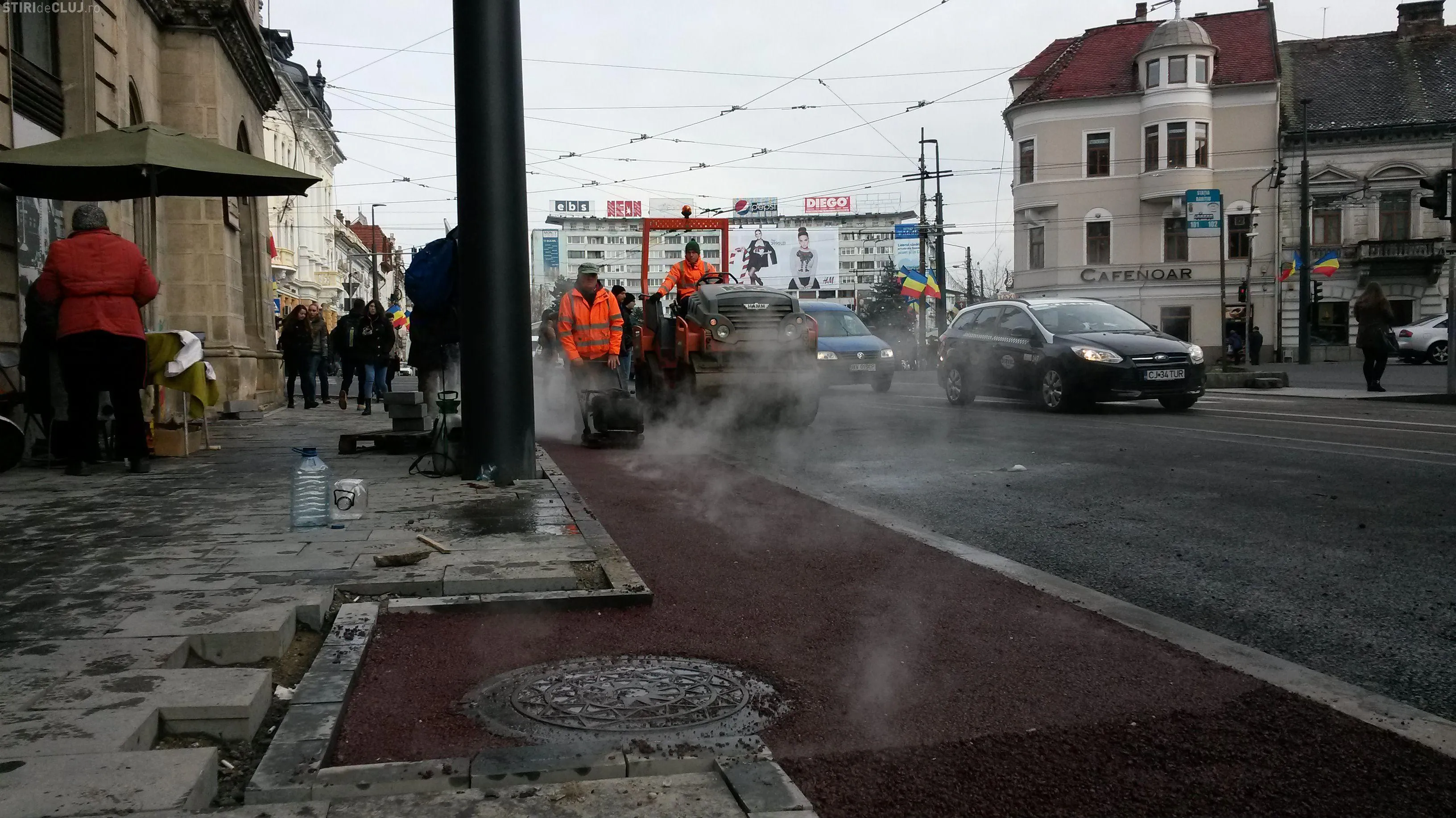 Vineri, 27 noiembrie, muncitorii firmei Kiat au început să toarne asfaltul colorat pe pista de bicicliști din fața fostei Case de modă.
