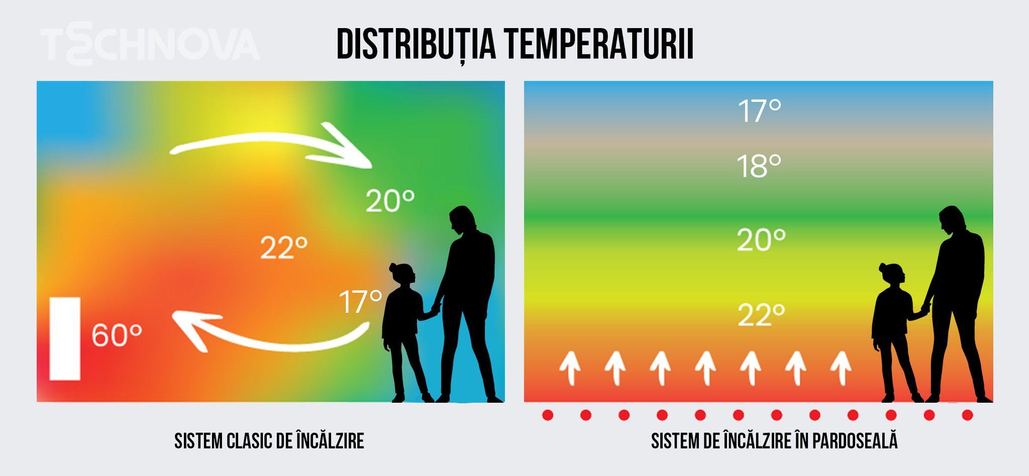 - Distribuție uniformă a căldurii: Sistemele de încălzire în pardoseală asigură confort termic întregului spațiu, fără a exista puncte calde sau puncte reci. Căldura este distribuită uniform în încăpere, asigurând constant o temperatură adecvată;