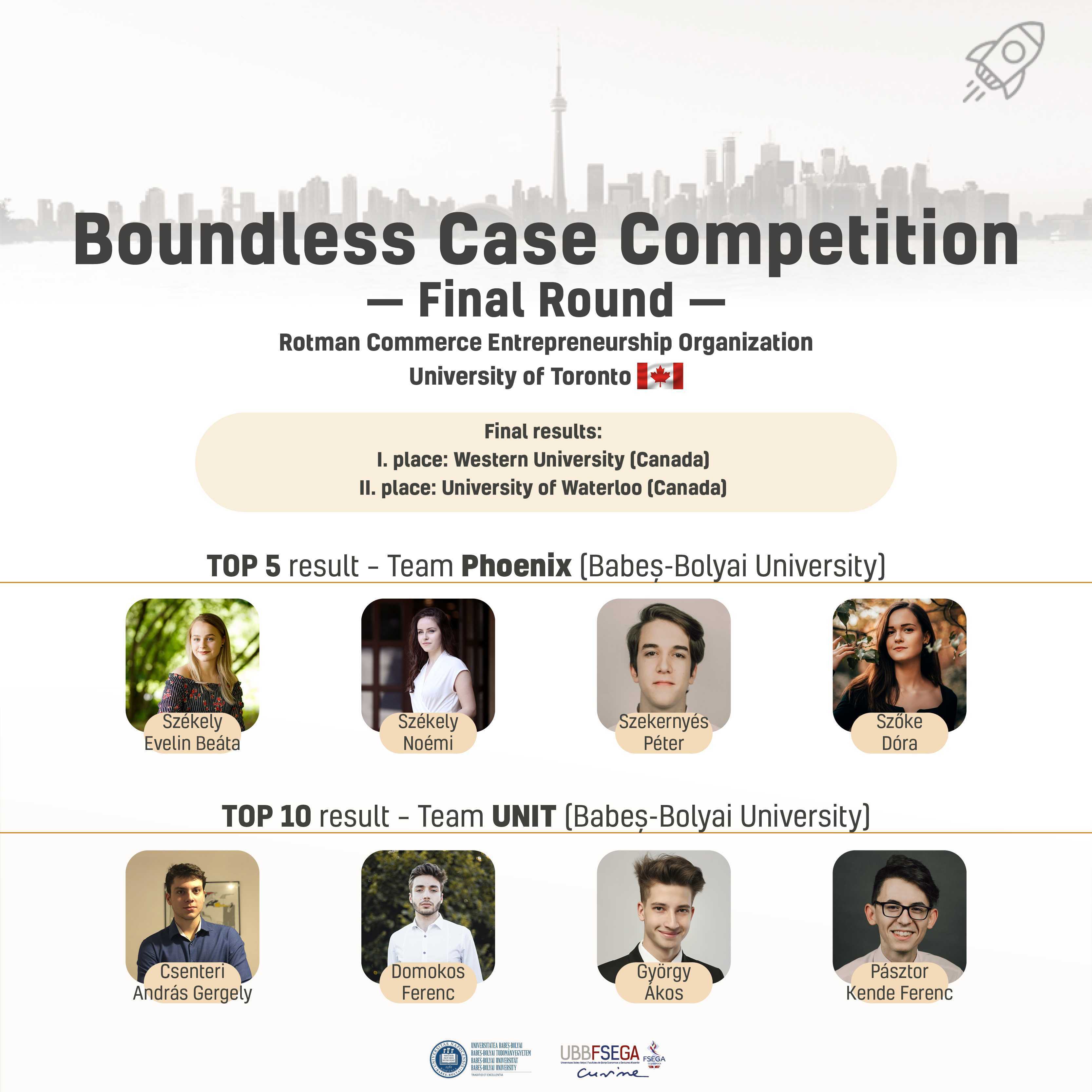 În finala globală Boundless Case Competition, organizată sâmbătă, 15 ianuarie 2022, în spațiul virtual, echipele au avut sarcina să elaboreze o strategie de expansiune, de finanțare și de marketing/vânzări pentru compania Novagrow, care își desfășoară activitatea în regiunea Quebec. După prezentările celor 10 echipe, juriul a selectat cele mai bune 5 echipe, inclusiv echipa Phoenix reprezentând UBB, acestea având ocazia de a-și prezenta strategia lor în fața juriului din finală.