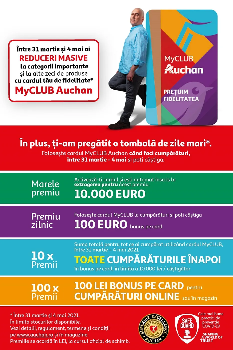 - 10 premii x toate cumpărăturile înapoi, prin returnarea integrală a sumei cheltuite pentru toate cumpărăturile efectuate prin cardul MyCLUB Auchan în perioada 31 martie – 4 mai, în limita a 10.000 lei/câștigător, în bonus pe card
