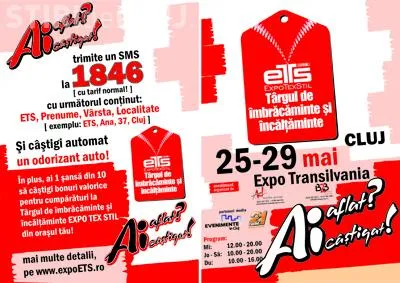 Campania"AI AFLAT AI CASTIGAT" continua. Trimite un SMS la 1846 cu urmatorul continut: "ETS, prenume, varsta, localitate" (Ex. ETS, ANA, 37, CLUJ) si castigi automat un odorizant auto, pe care il poti ridica in timpul targului de la Expo Transilvania. In plus, ai o sansa din 10 sa castigi bonuri valorice pentru cumparaturi la targ. Detalii pe www.expoETS.ro