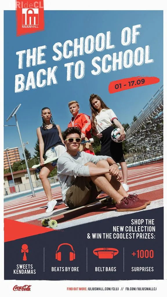 La Iulius Mall Cluj începe „școala” care te pregătește să fii cool atunci când va suna clopoțelul. În perioada 1 – 17 septembrie 2017, te invităm să descoperi „The school of back to school”. Știm că ești în căutarea rechizitelor, ținutelor și accesoriilor pentru noul an școlar, așa că suntem gata să îți venim în ajutor și să ne asigurăm că nu îți lipsește distracția. Dacă faci cumpărături în valoare de minimum 100 de lei în perioada campaniei, te așteptăm cu bonurile fiscale la centrul de premiere, amenajat chiar lângă Centrul Info Iulius Mall Cluj, unde vei fi înscris electronic. Dacă te numeri printre primii 100 de participanți din fiecare zi, vei primi garantat un premiu. Poate fi o borsetă haioasă, un joc Kendama pentru antrenamente prelungite, căști audio care să te ajute să iei muzica oriunde cu tine sau băuturi răcoritoare.