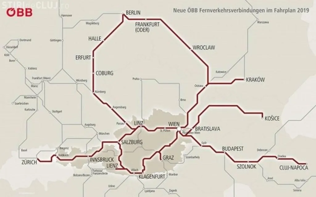 Un tren va face legătura între Cluj-Napoca și Viena, via Oradea și Budapesta.
