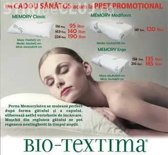 Cu ocazia sarbatorilor de iarna Bio-Textima va rasfata cu un cadou perfect: Pernele Memory la preturi speciale. Pernele memory foam sunt fantastice. Au un singur dezavantaj: dupa ce ati folosit aceste perne este greu sa dormiti pe alte perne sau fara perna.