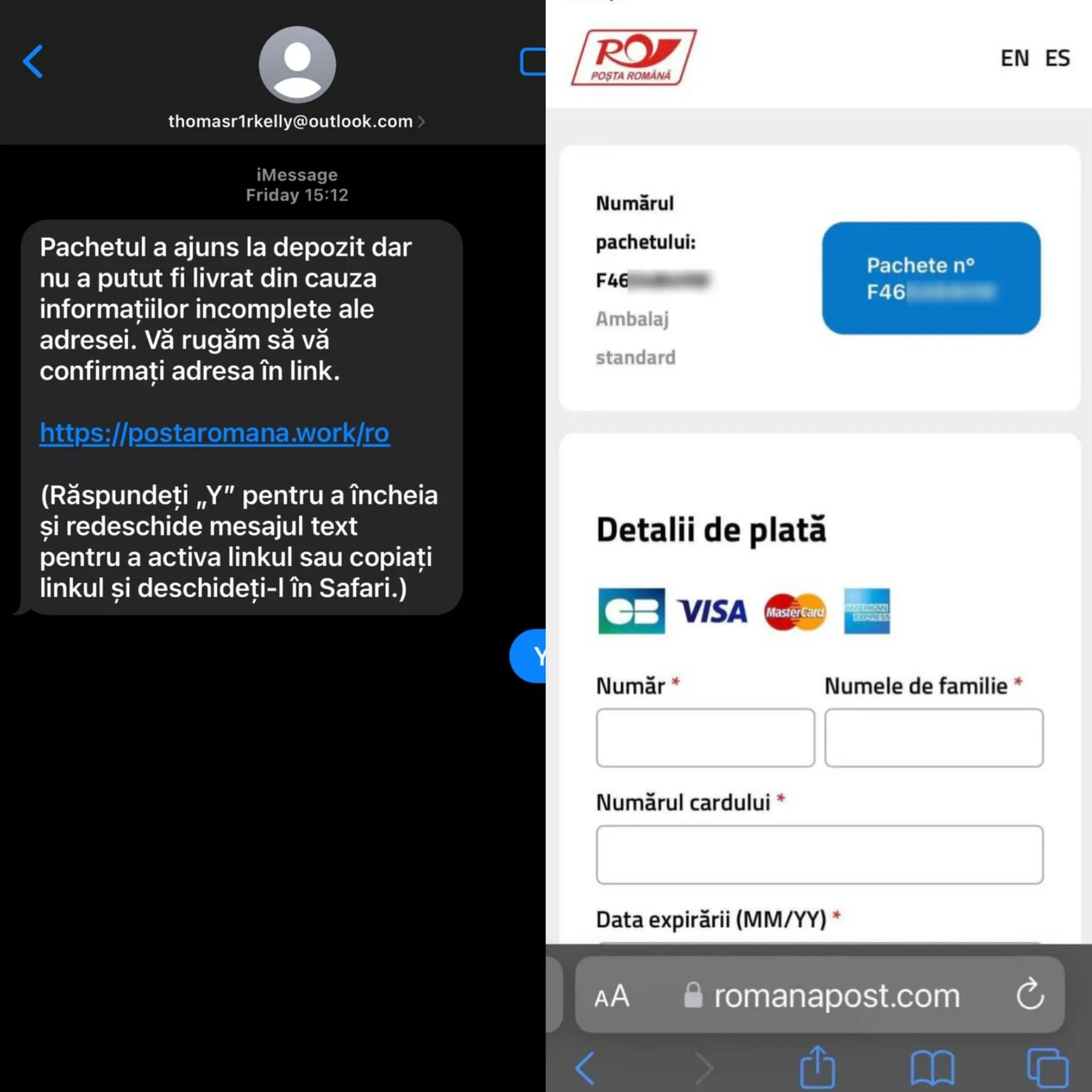 Aflat în așteptarea unui colet prin Poșta Română, clujeanul a primit un mesaj SMS de pe un numar din Romania care îl informa că "Pachetul a ajuns la depozit dar nu a putut fi livrat din cauza informațiilor incomplete ale adresei. Vă rugăm să confirmati adresa în link".