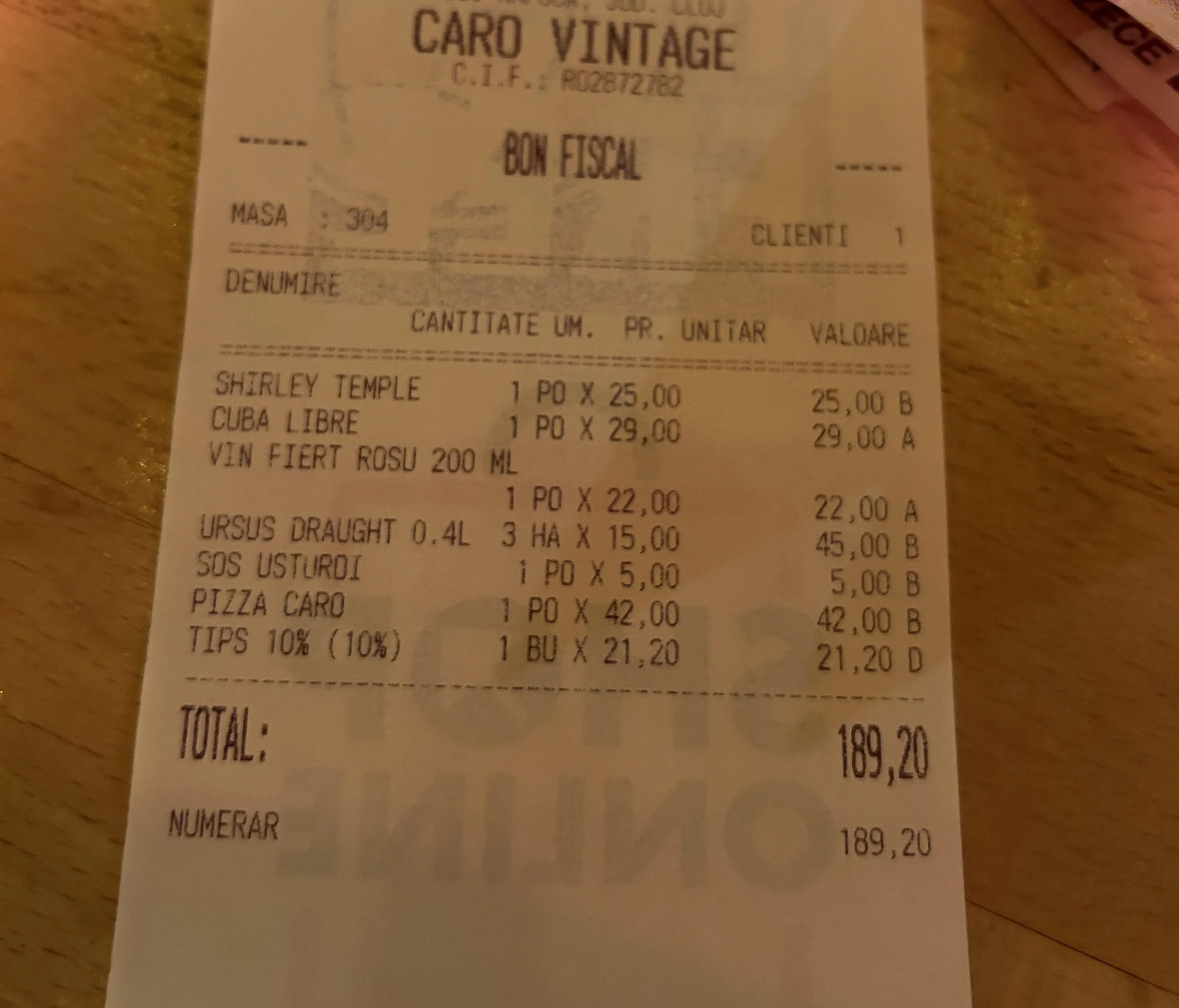 Practic, pe bonul de plată apare suma de 21 de lei bacșiș, 10% din totalul de 189 de lei. ”Cum ai bacșiș de 10% în valoare de 21,2 lei, iar tot bonul este de 189 de lei?”, s-au minunat internauții.