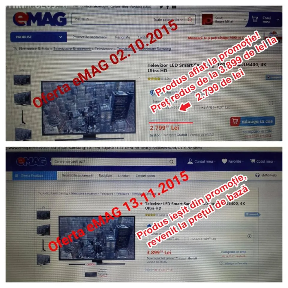 Este vorba despre un televizor Samsung, care costa în 2 octombrie 2799 de lei, iar în 13 noiembrie a ajuns la valoarea de 3899 de lei, fără ca în primul caz să scrie că ar fi fost vorba despre o reducere, iar la expirarea promoției prețul să fi ”sărit” la loc.