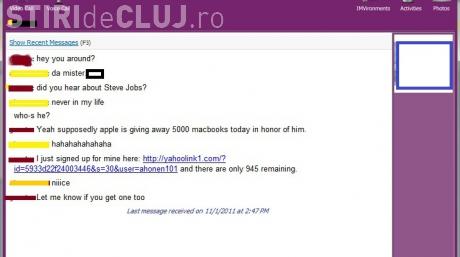 Te poate pacali usor sa intri pe pagina respectiva pentru ca face conversatie despre Steve Jobs , iar apoi iti spune ca astazi Apple ofera 5000 de Mac-uri in cinstea fondatorului companiei. Ca sa te inscrii , trebuie sa dai click pe link-ul pe care ti-l trimite. Nu o faceti, pentru ca apoi veti avea neaparat nevoie de un IT-ist care sa va curete calculatorul.