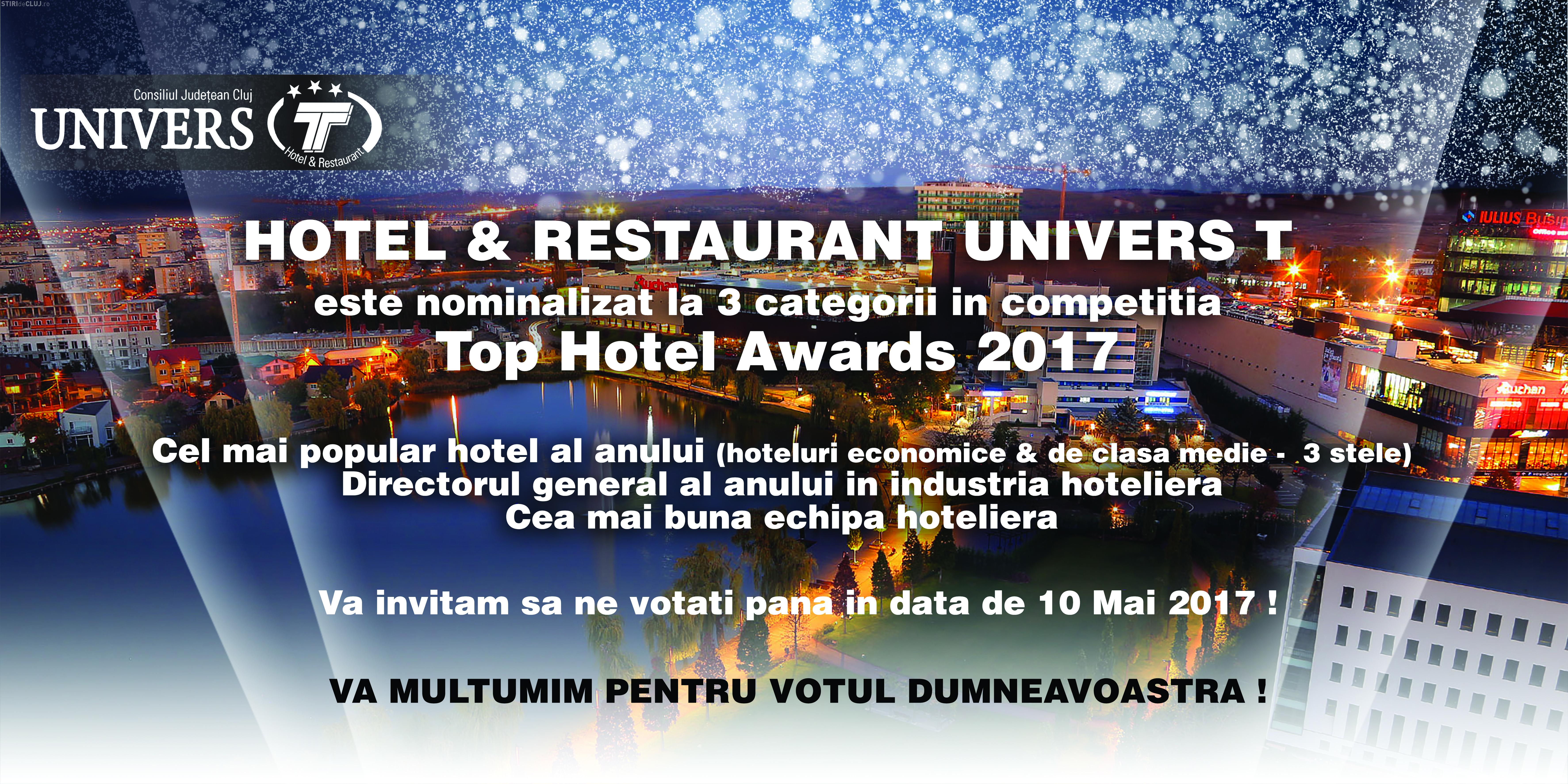 Compania si managementul Univers T, fac parte din elita turismului din romanesc, prin prezenta în finala prestigioasei competiții Romanian Top Hotel Awards 2017. Este vorba de premiile excelenței în industria hotelieră, a turismului și ospitalității din România, unde Hotelul Univers T a fost nominalizat la 3 categorii.