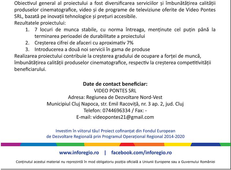 Video Pontes SRL a finalizat implementarea proiectului”Achiziționare echipamente de producție cinematografică, video și de programe de televiziune”, cod SMIS 106312, finanțat prin Programul Operațional Regional 2014-2020. Valoarea totală a proiectului a fost de 953.935,70 lei, din care 641.204,02 lei reprezintă finanțare nerambursabilă. Valoarea nerambursabilă din FEDR este de 545.023,42 lei. Programul Operațional Regional 2014-2020 este implementat la nivel național de către Ministerul Dezvoltării Regionale și Administrației Publice, în calitate de Autoritate deManagement, iar la nivel regional de către Agenția de Dezvoltare Regională Nord-Vest, Organism Intermediar al programului ce monitorizează implementarea acestui proiect.