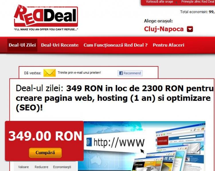Pachetul de reducere oferit de Reddeal include creare site web, maximum 10 pagini, modul de administrare a site-ului, gazduire gratuita a site-ului timp de un an, adrese dee e-mail nelimitate, optimizare SEO ( Google, Yahoo, Bing) pe cinci cuvinte sau fraze de cautare.