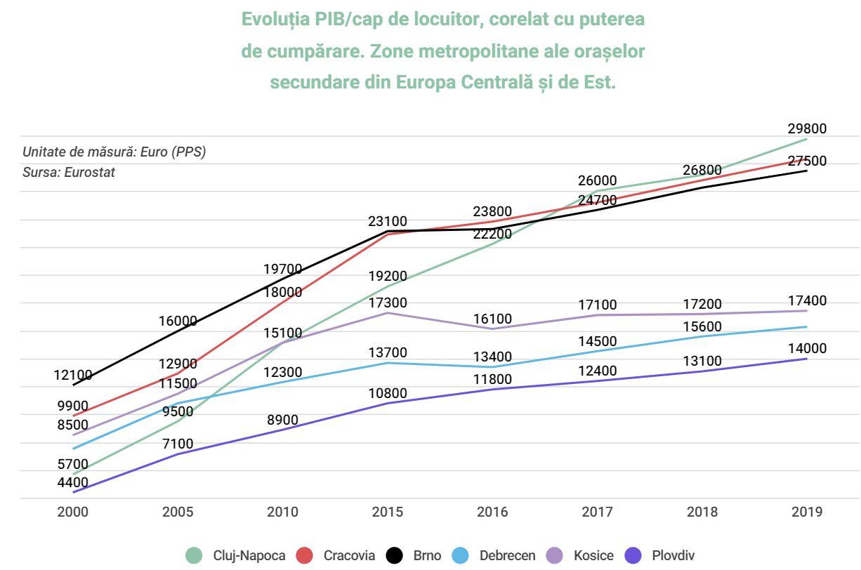 Zona metropolitană a Clujului a depășit alte zone importante din orașelor similare din Polonia sau Cehia în ceea ce privește Produsul Intern Brut pe cap de locuitor.