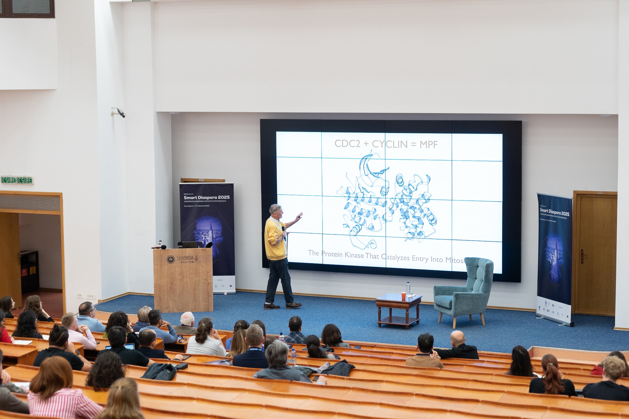 Profesorul Tim Hunt, laureat al Premiului Nobel pentru Fiziologie/Medicină (2001) și Doctor Honoris Causa al Universității Babeș-Bolyai, a fost ieri invitat de onoare al instituției și keynote speaker în cadrul unei sesiuni speciale organizate de UBB. Evenimentul face parte din Conferința „Diaspora Științifică Românească – Smart Diaspora”, desfășurată la Cluj-Napoca în perioada 4–7 noiembrie 2025.