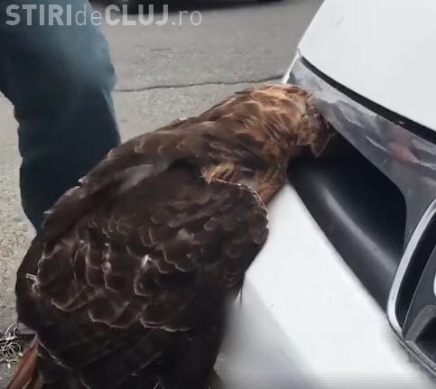 A lovit cu mașina un șoim ieșit la vânătoare! Pasărea s-a prins cu capul în radiator - VIDEO