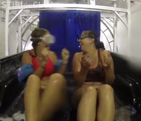 Două fete îmbrăcate în costume de baie au vrut să vadă cum este spălată o mașină și s-au așezat în remorca unui pick-up și au trăit experiența pe viu.
