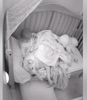 Câinele s-a urcat în pătuț lângă copil, iar acesta avea maximă grijă să nu îi fie frig și să se simtă cât mai bine.