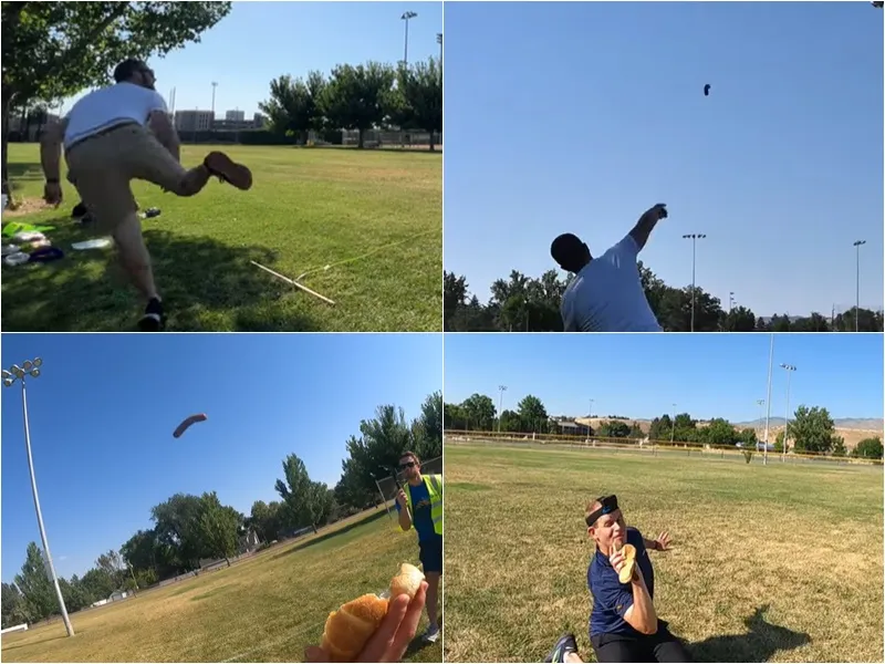 VIDEO - Record plin de haz: Un bărbat a reușit să prindă un crenvurst aruncat de la peste 50 de metri distanță direct într-o chiflă