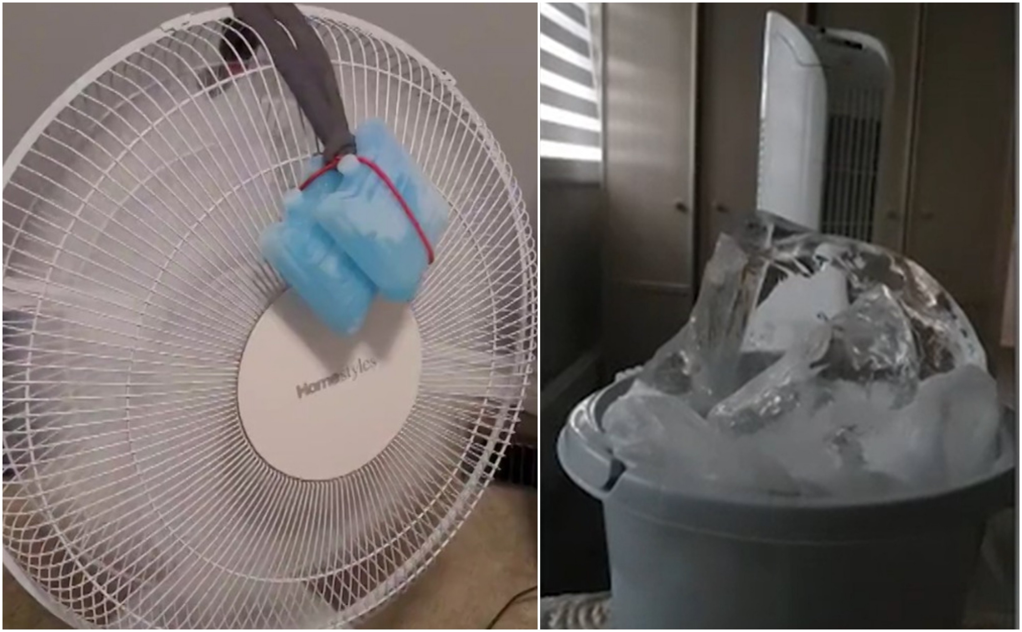 Trucul pe care tot mai mulți internauți îl pun în aplicare presupune agățarea unor recipiente cu gheață de un ventilator în funcțiune, briza generată ar fi astfel mult mai răcoroasă. Specialiștii spun însă că metoda presupune un risc major de electrocutare.