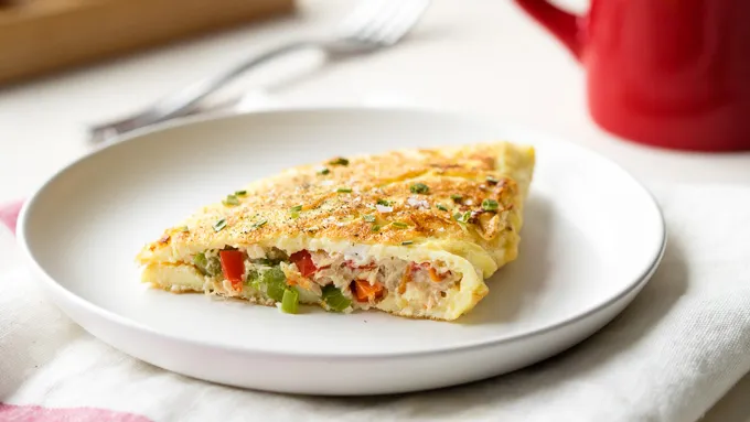 Rețetă de omletă la tigaie cu ton și ardei, perfectă pentru un mic dejun gătit rapid și sănătos. Mâncarea poate fi gata în mai puțin de 5 minute